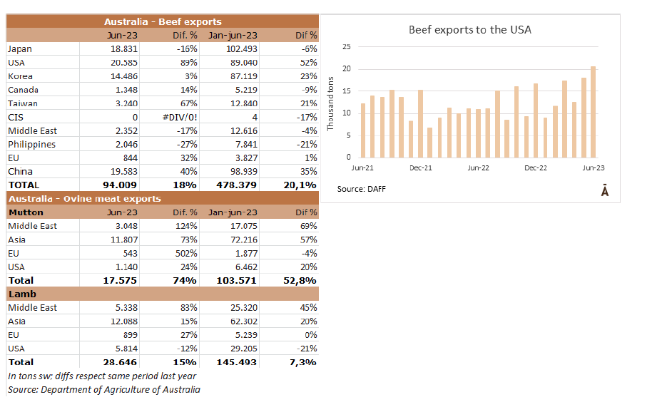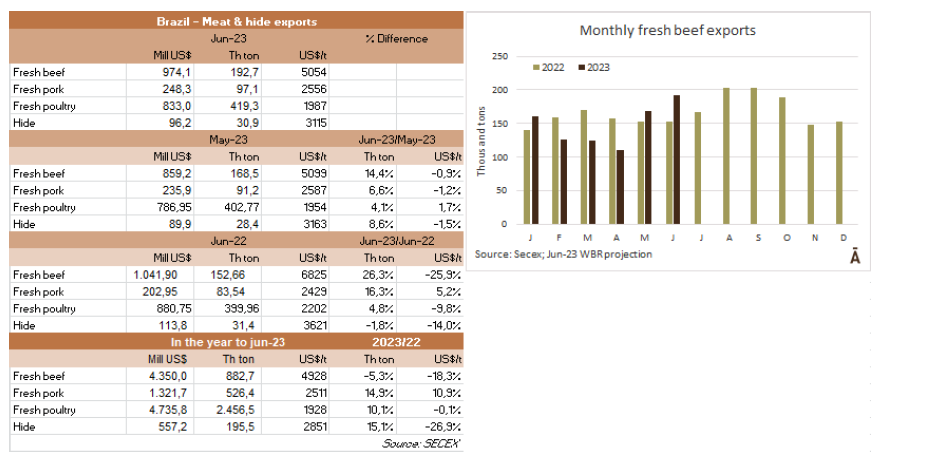 在2023年上半年,巴西出口了88.3萬(wàn)噸牛肉,平均價(jià)值為每噸4928美元,年出口量下降了5.3%,平均價(jià)值下降了18.3%。豬肉和雞肉的出口每年分別增長(zhǎng)15%和10%。