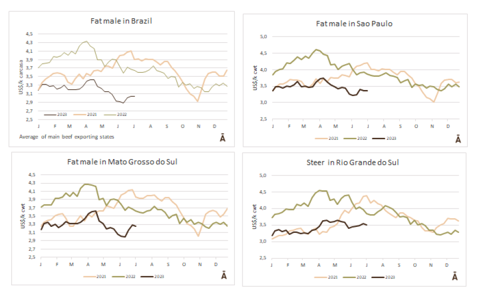 巴西,以雷亞爾計(jì)算的價(jià)格的小幅回升被匯率的下降所逆轉(zhuǎn)。主要出口國(guó)的肥牛下跌1美分,至每公斤3.03美元,仍然是該地區(qū)的最低參考價(jià)格。