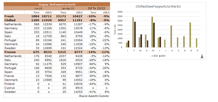 根據(jù)海關(guān)報(bào)告的數(shù)據(jù),6月份,烏拉圭出口了26902噸牛肉,均價(jià)5900美元/噸。在每月的比較中,數(shù)量和中間值都下降了5%。均價(jià)擺脫了1月至5月的升值趨勢(shì),降至去年1月以來(lái)的最低水平。