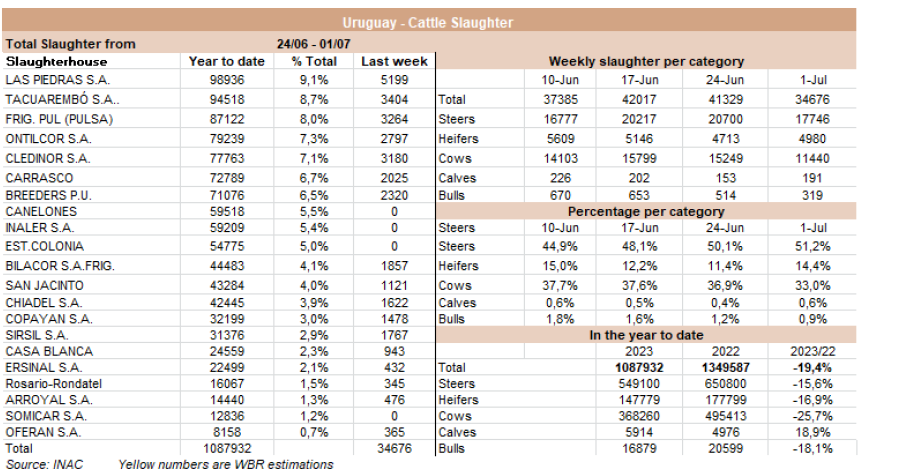 活動(dòng)最多的工廠仍然是拉斯皮德拉斯,有5199頭牛,其次是馬弗里格-塔庫(kù)倫博(3404頭)和米涅瓦-普爾薩(3264頭)。MF只在兩個(gè)工廠工作,屠宰了6,584頭動(dòng)物,而Minerva也在兩個(gè)工廠屠宰了5289頭,因?yàn)?span>Canelones的工人從本周起開(kāi)始集體休假,上周沒(méi)有進(jìn)行屠宰。