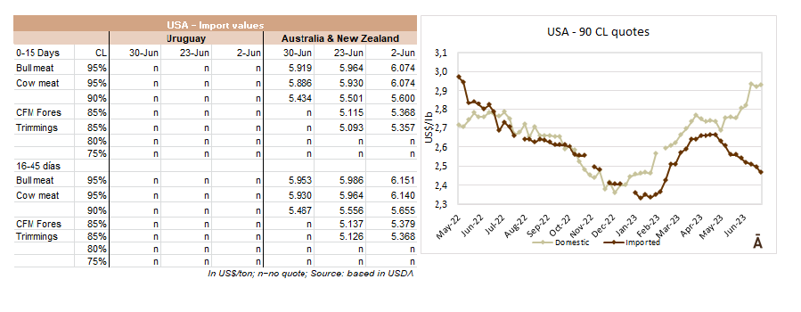 與前一周相比,美國(guó)進(jìn)口肉類(lèi)價(jià)格大多適度下降,不存在大幅下降的情況,交易緩慢。獨(dú)立日假期前的需求弱于預(yù)期,對(duì)價(jià)格造成了壓力。根據(jù)美國(guó)農(nóng)業(yè)部的周報(bào),隨著季節(jié)性收獲的結(jié)束,澳大利亞和新西蘭的奶牛和公牛屠宰數(shù)量減少。