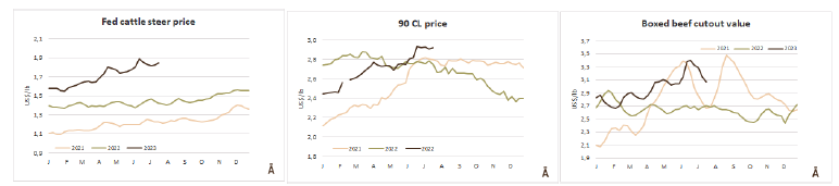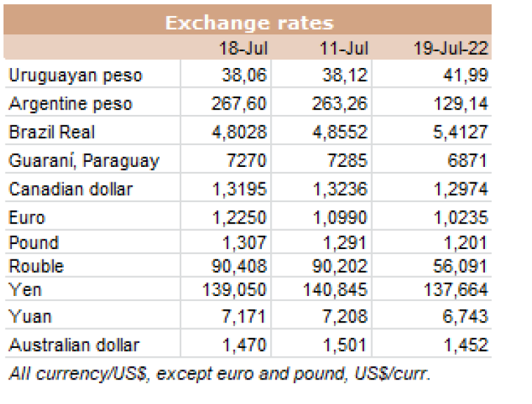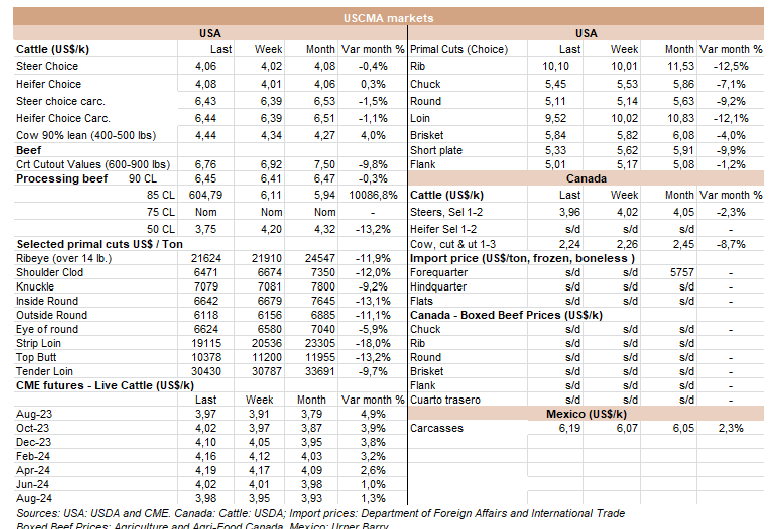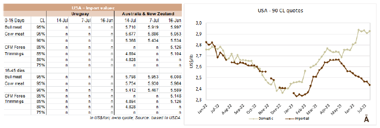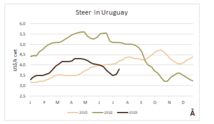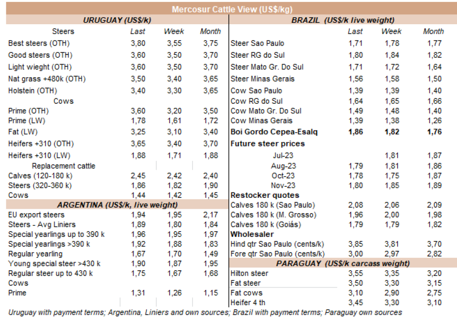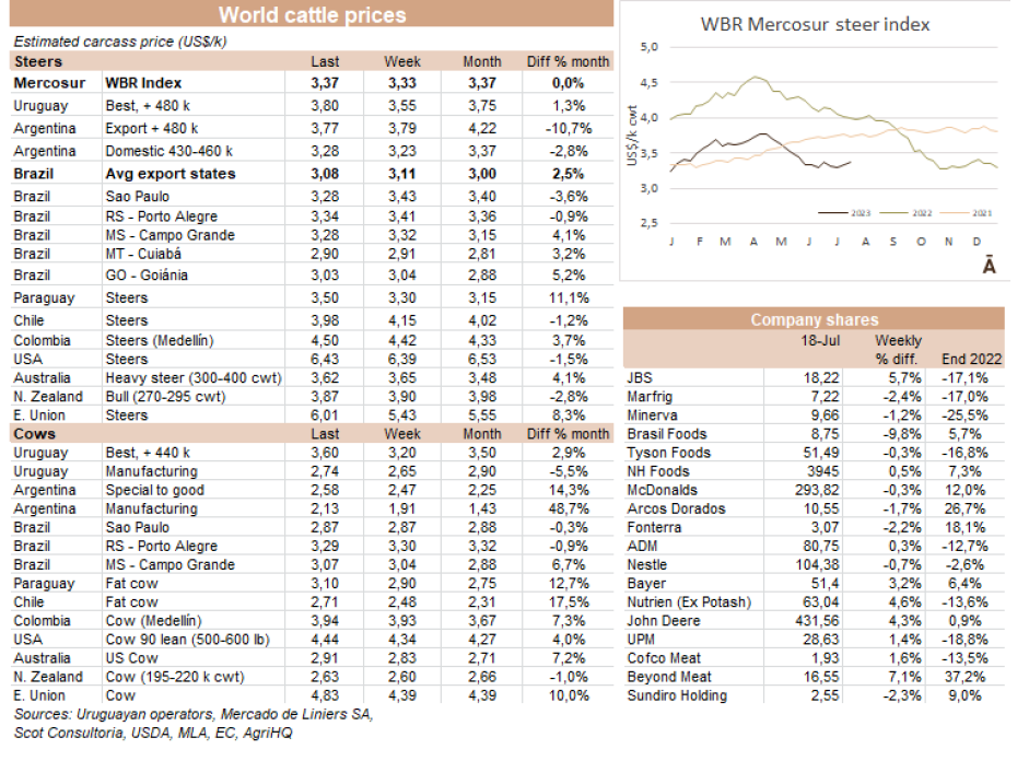 世界牛肉報告顯示過去一周南方共同市場閹牛價格上漲4美分至3.37美元/公斤。牛肉屠宰量增加,烏拉圭上漲了7%,巴拉圭上漲了6%,阿根廷市場保持穩(wěn)定,而巴西出口平均數(shù)減少了1%(-3美分)至每公斤3.08美元。雷亞爾對美元的升值(+1%)阻止了該地區(qū)牛價格的進一步下跌。