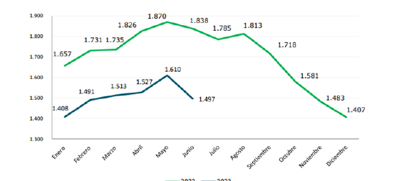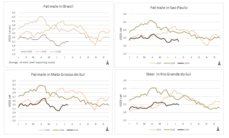 根據(jù)巴西環(huán)境與分析研究所上周發(fā)布的數(shù)據(jù)顯示,由于季節(jié)性調(diào)整,5月份的零售額比4月收縮了1%。與2022年5月相比,零售額也下降了1%,遠(yuǎn)低于分析專家關(guān)于1.6%復(fù)蘇的預(yù)期。預(yù)計7月份出口量將低于16萬噸。上周牛肉出口達到3.925萬噸,周增長5.01%。7月前十個工作日,牛肉出口約7.663萬噸,平均0.766萬噸/天,比2022年7月的日均水平低3.72%。Agrifatto稱:“通常情況下,前兩周的出貨量是最大的,7月迄今為止的統(tǒng)計數(shù)字表明,本月16萬噸的出口預(yù)期很難完成。