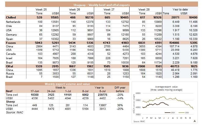 以烏拉圭為例,以色列進口商通過施壓降低屠宰合同的價格,一位出口商警告稱:“如果他們不設(shè)法降低價值,他們就會停止生產(chǎn)”。一位進口商指出,這種“壓力”也影響了與巴西的合同。另一方面,與烏拉圭協(xié)定一天屠宰350頭,價格是7000元/噸。阿根廷方面,合同還是維持8000美元FOB/噸。