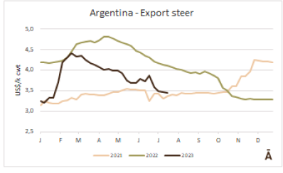 根據(jù)阿根廷飼養(yǎng)場協(xié)會的一份報告顯示,涵蓋98個場所,可容納757000頭牛,6月份的安置率為73%,比前一年同月高出兩個百分點。與此同時,小牛/公牛的比例為0.92,比2022年同月低8%。然而,毛利率比一年前大幅下降了。在育肥場牛的平均壽命從去年6月的170天降至144天。關(guān)于玉米/公牛的比例,增長了50%,達到0.12