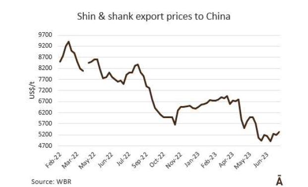 到目前為止,2023年,牛肉出貨量達(dá)到32.2萬噸,比2022年同期增加了約2萬噸(6.8%),主要原因是對(duì)中國銷售額的增加,中國的牛肉量占79.0%。以色列緊隨其后占5.6%,德國占3.6%;美國為2.9%,智利為2.7%。2022年7月至2023年6月,牛胴體重量出口累計(jì)91.7萬噸,此外還有99.5萬帶骨肉和牛骨,價(jià)值超過30.21億美元。牛內(nèi)臟出口量下降了20%至9800噸,價(jià)值近1400萬美元 .