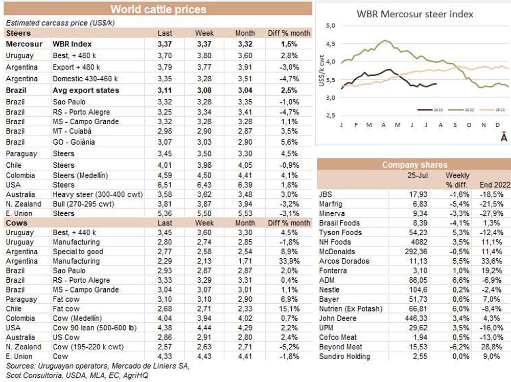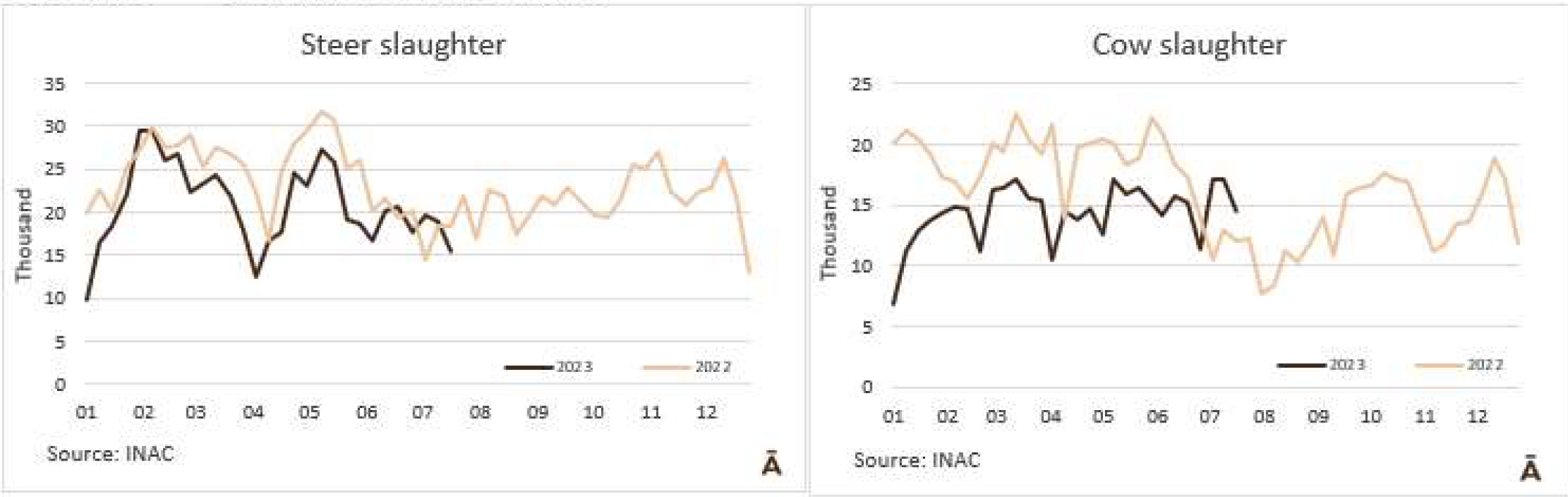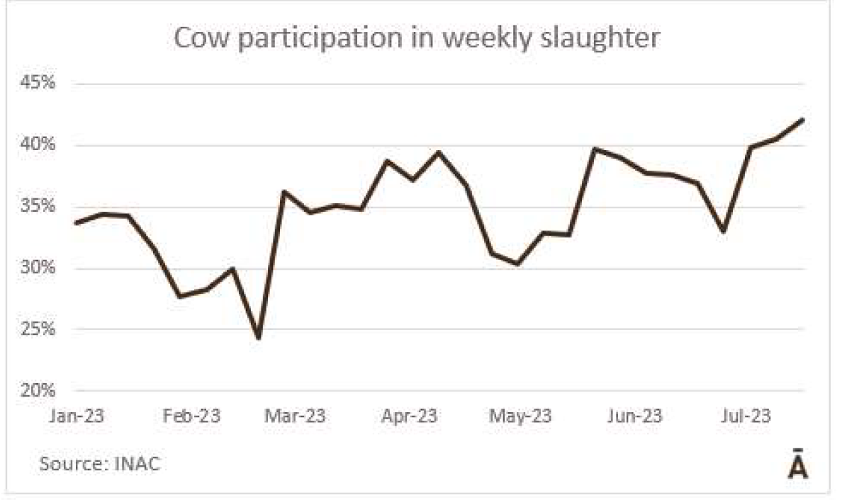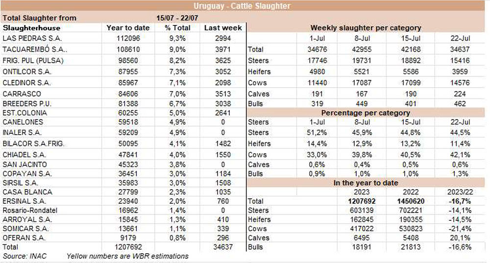 由于7月18日的非工作假期,上周的牛屠宰量下降約7500頭,與去年非常相似(-1%)。INAC報(bào)告稱,有34637頭牛進(jìn)入工廠。奶牛周減少量為15%(14576頭),是減少比例最小的。奶牛屠宰量占總量的42.1%,是今年迄今為止的最高比例。另外15416頭公牛(周減少量為-18%)和3959頭小母牛(周減少量是29%)被屠宰。屠宰量最大的公司是Marfrig-Takuaremb6(3971),Minerva、Pulsa(3625)和Carrasco(3513)。Marfrig在一周內(nèi)屠宰了8710頭牛,而Minerva和另外兩個(gè)工廠這周屠宰了7138頭牛。7月份的前22天,牛屠宰數(shù)量達(dá)到121942頭,比2022年同期高14.4%。這樣一來,本月的屠宰量肯定會(huì)出現(xiàn)強(qiáng)勁的收縮趨勢。連續(xù)13個(gè)月下降后,與上年同月相比首次出現(xiàn)增長。