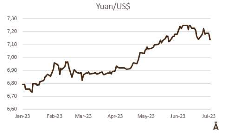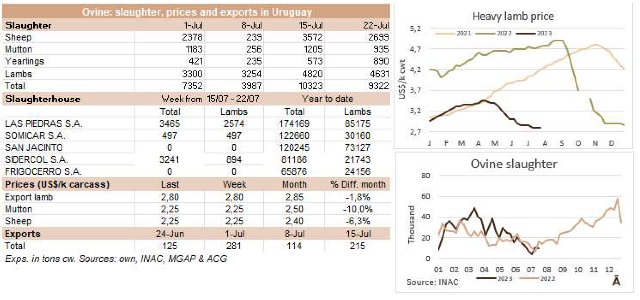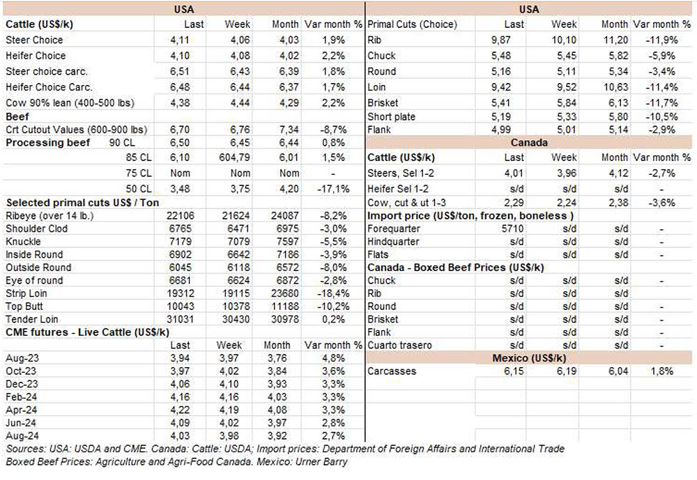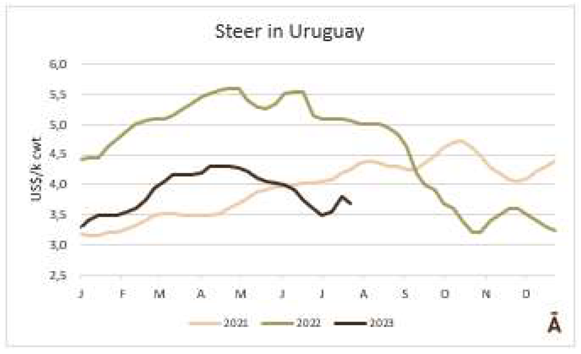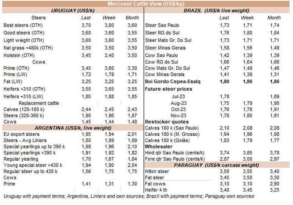 由于7月18日的非工作假期,上周的牛屠宰量下降約7500頭,與去年非常相似(-1%)。INAC報(bào)告稱,有34637頭牛進(jìn)入工廠。奶牛周減少量為15%(14576頭),是減少比例最小的。奶牛屠宰量占總量的42.1%,是今年迄今為止的最高比例。另外15416頭公牛(周減少量為-18%)和3959頭小母牛(周減少量是29%)被屠宰。屠宰量最大的公司是Marfrig-Takuaremb6(3971),Minerva、Pulsa(3625)和Carrasco(3513)。Marfrig在一周內(nèi)屠宰了8710頭牛,而Minerva和另外兩個(gè)工廠這周屠宰了7138頭牛。7月份的前22天,牛屠宰數(shù)量達(dá)到121942頭,比2022年同期高14.4%。這樣一來,本月的屠宰量肯定會(huì)出現(xiàn)強(qiáng)勁的收縮趨勢。連續(xù)13個(gè)月下降后,與上年同月相比首次出現(xiàn)增長。
