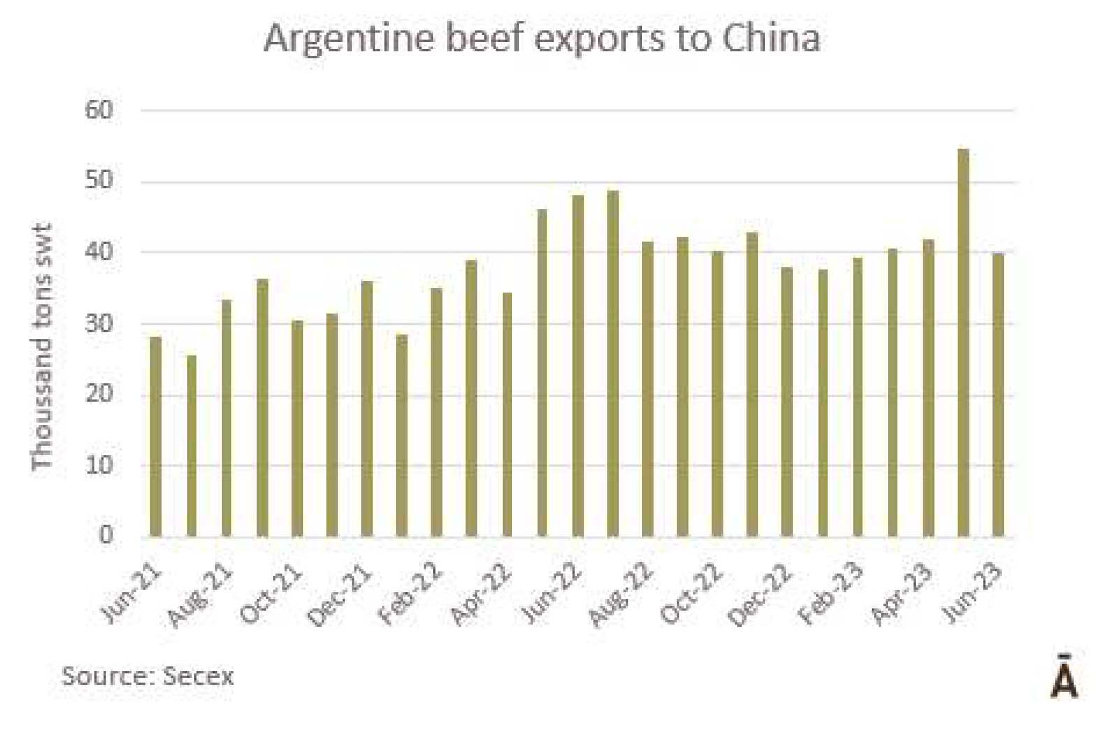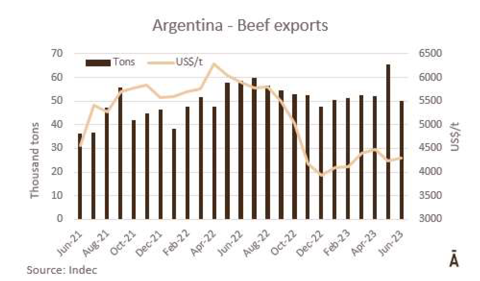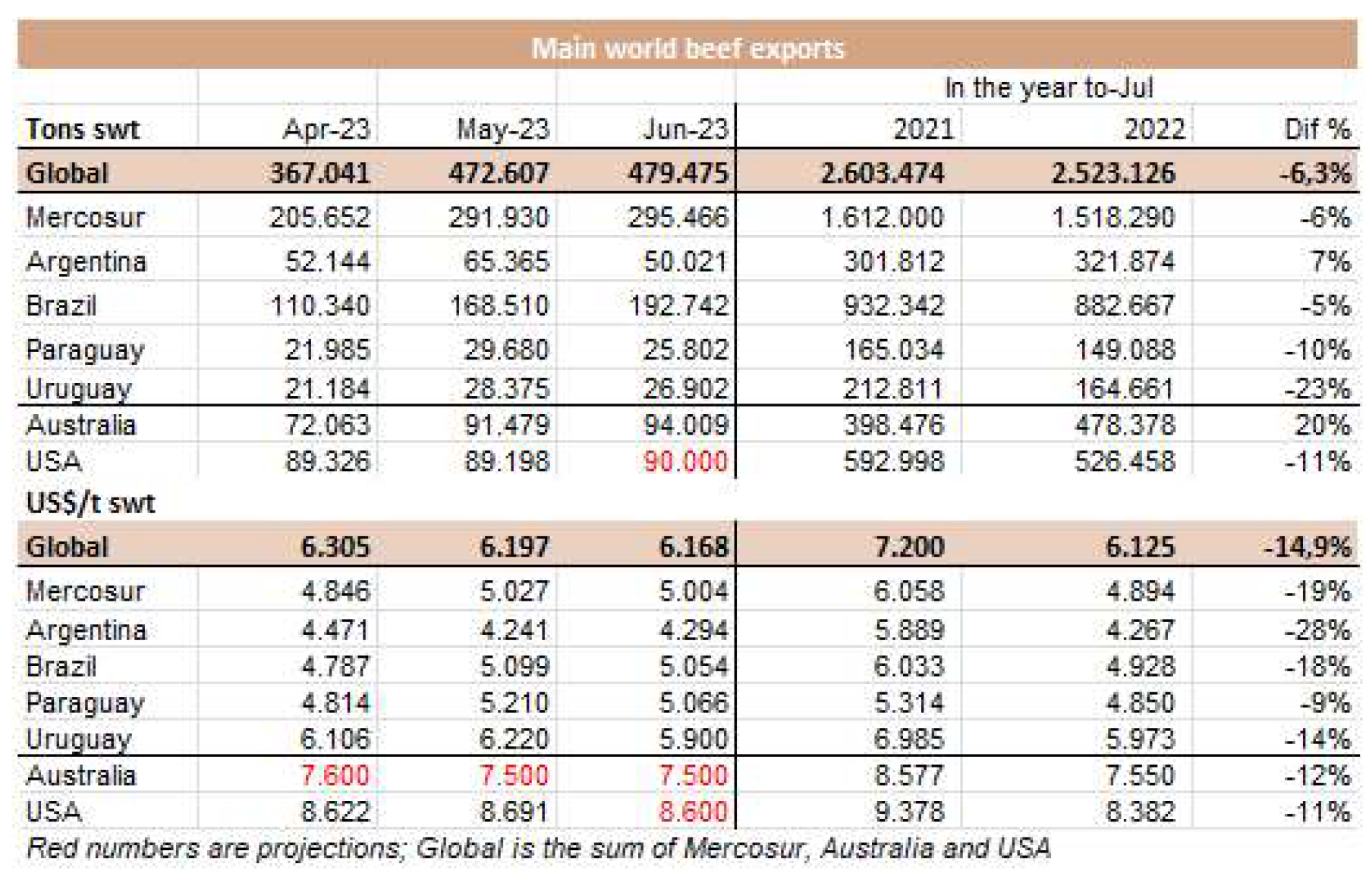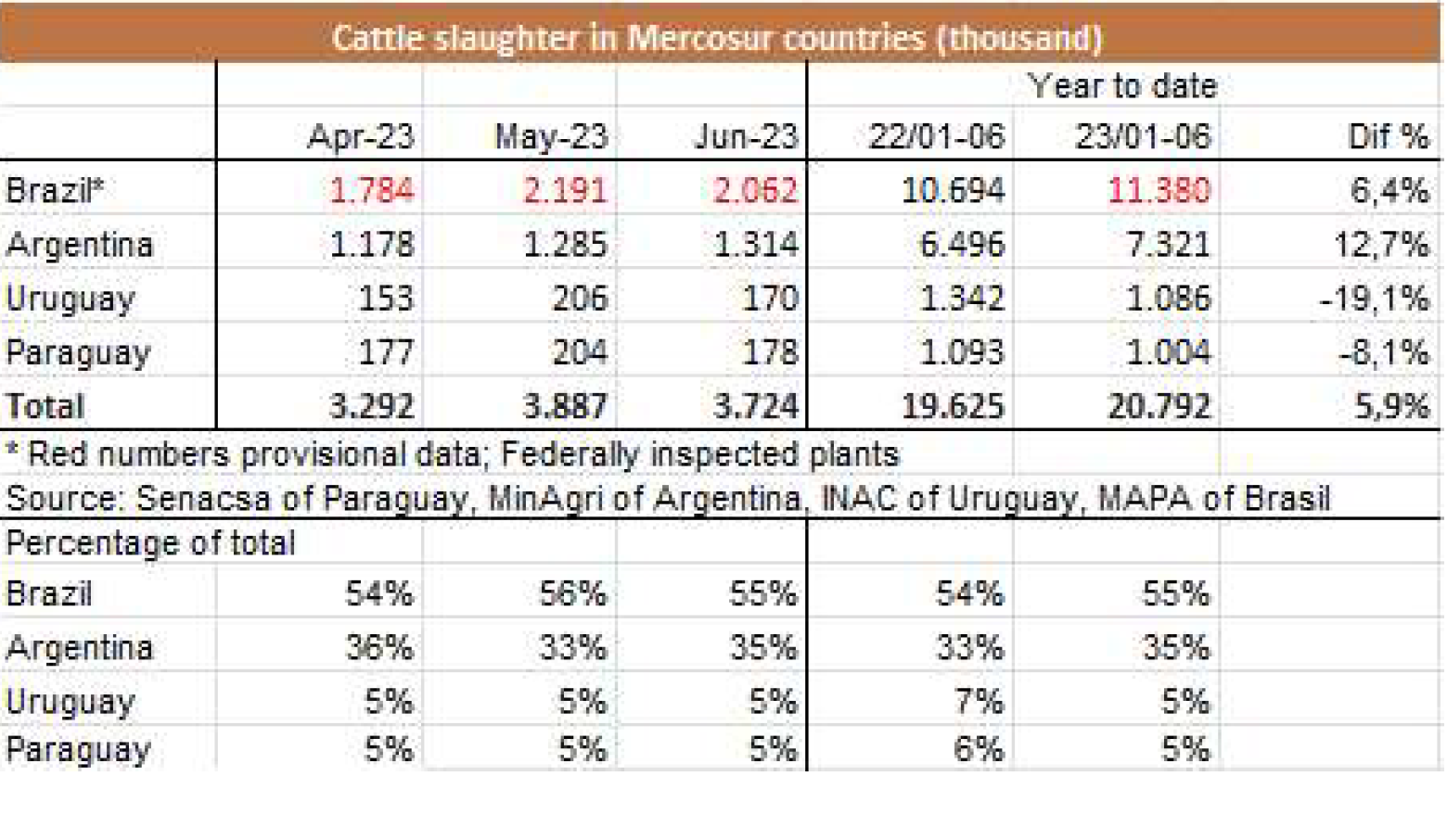 6月份冰鮮、冷凍和加工牛肉的出口總量略高于5萬噸(4.1萬噸肉和0.9萬帶骨肉)。根據(jù)統(tǒng)計(jì),這是2023年迄今為止的最低月產(chǎn)量,比去年5月低24%,比6月低15%。SENASA衛(wèi)生服務(wù)部門的數(shù)據(jù)顯示六月份出口量比5月高,差異“主要是運(yùn)往中國的數(shù)量上,實(shí)際上比預(yù)計(jì)少1萬噸?!?/span> 據(jù)美國廣播公司報(bào)道,“牛肉屠宰和生產(chǎn)一直處于高水平,6月份出口量的意外下降,主要是由于在支付國外運(yùn)費(fèi)方面出現(xiàn)了困難。就貨值而言,6月份的出口額接近2.15億美元,比上月降低22.5%,比去年的3.46億美元降低了38%。