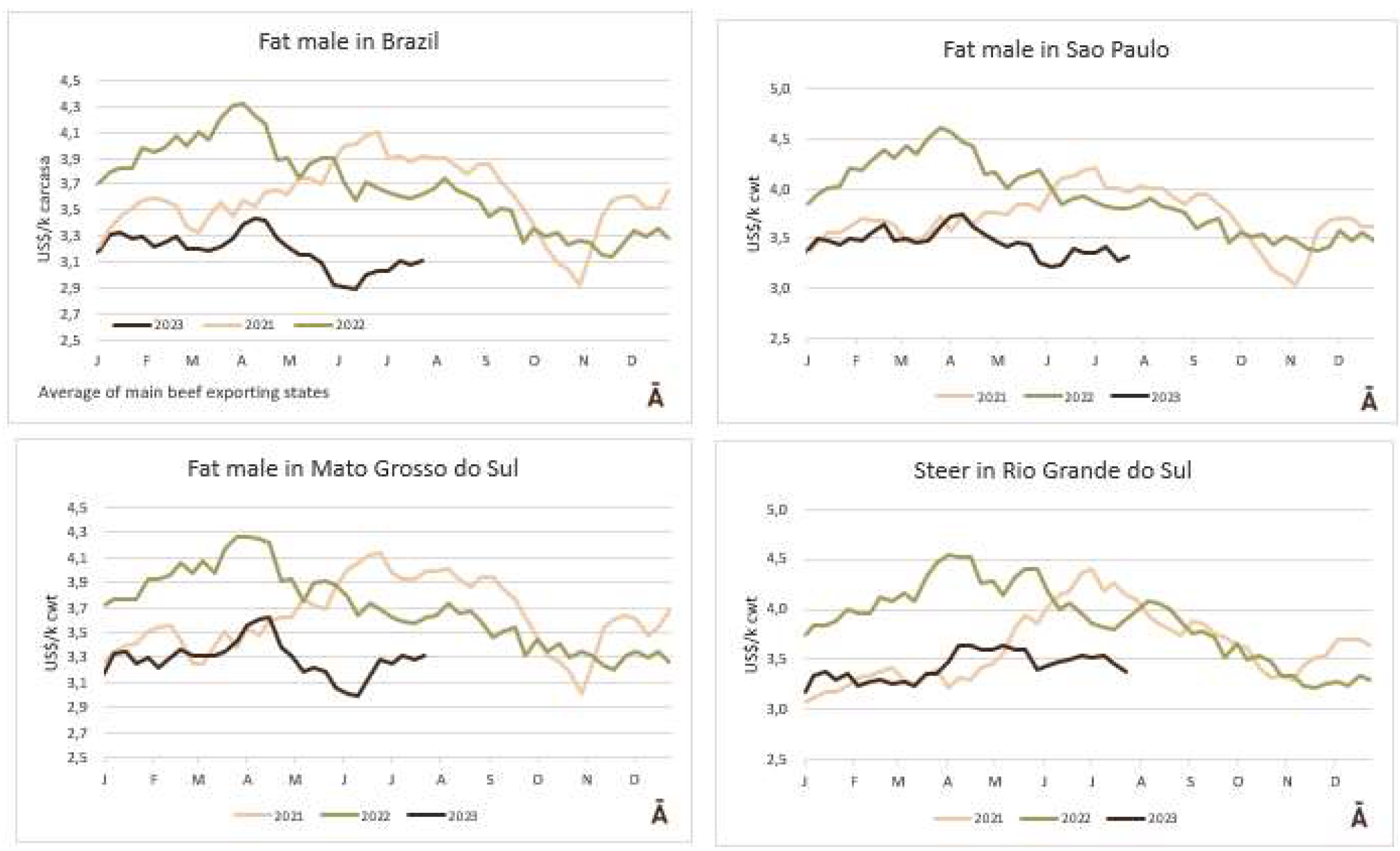 經(jīng)過前一周的下調(diào),本周巴西主要養(yǎng)牛區(qū)的屠宰牛價(jià)格保持穩(wěn)定。圣保羅州普通育肥牛平均價(jià)格是236.5雷亞爾/15公斤,出口中國市場30月齡以下的育肥牛價(jià)格高10雷亞爾/15公斤。巴西主要的牛市場價(jià)格與上周保持一致;批發(fā)市場的牛肉庫存給宰牛的價(jià)格造成了下行壓力。8月初,隨著父親節(jié)需求的增加,價(jià)格預(yù)計(jì)會(huì)上漲。