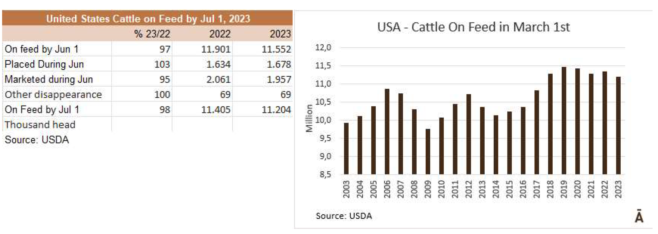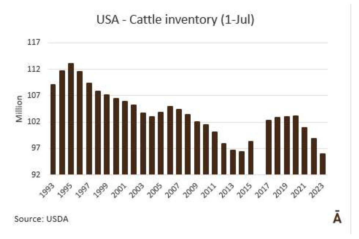美國農(nóng)業(yè)部國家農(nóng)業(yè)統(tǒng)計(jì)局稱7月 1日牛庫存的數(shù)量是9590萬頭,比去年的9860萬頭低3%,是自1971年以來最小的庫存。所有奶牛和小母??傆?jì)3880萬頭,比2022年7月1日的3960萬頭低2%。2940萬頭的肉牛比一年前減少了3%。奶牛數(shù)量為940萬頭,與前一年相比沒有變化。