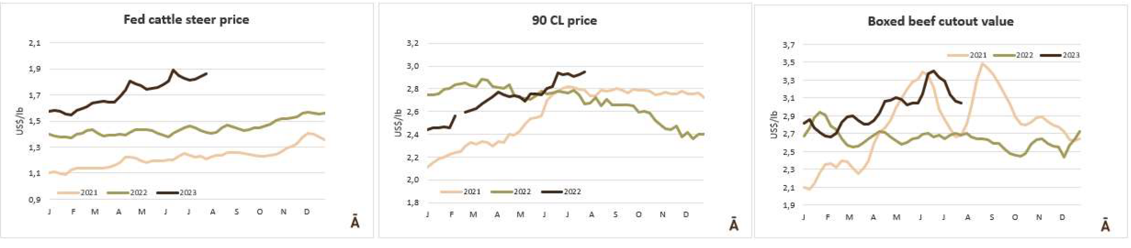 與前一周相比,北部地區(qū)活牛成交價(jià)上漲了2美元至188美元/百榜,屠宰牛成交價(jià)上漲了5美元至295美元/百磅。南部地區(qū)活牛參考價(jià)180美元/百磅,較之前有2美元/百磅的上漲。