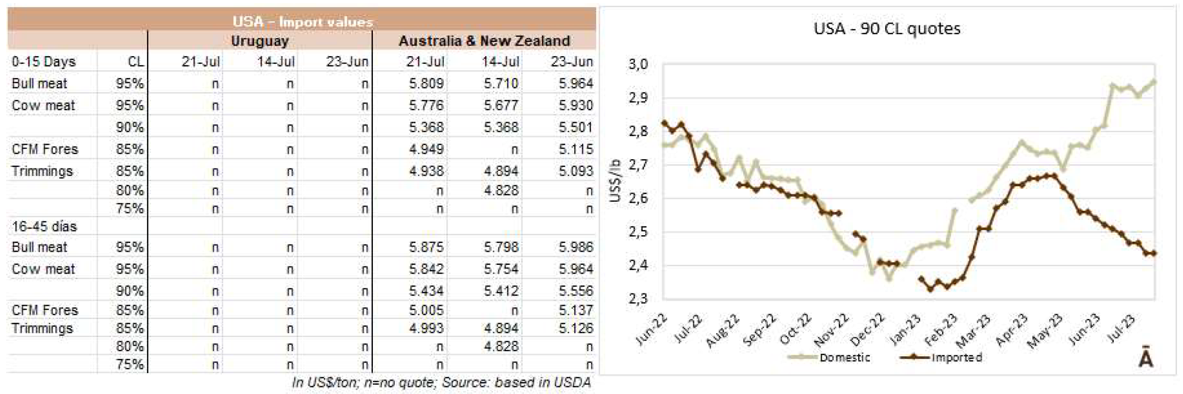 烏拉圭的美國進(jìn)口市場對(duì)牛肉砌塊保持著“良好的需求”,90CL的牛前非配額銷售價(jià)格是CFR4000美元,95CL是4200美元,85CL是3600美元。