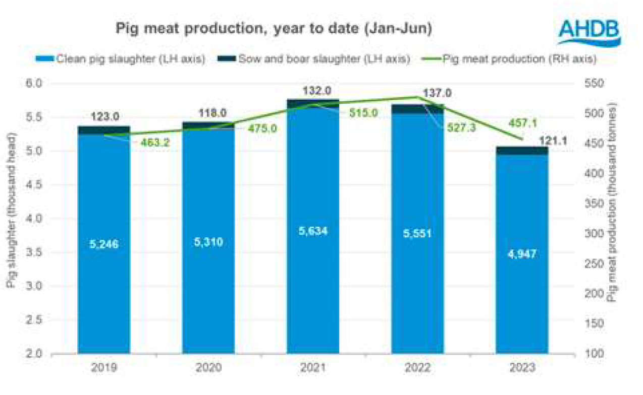 由于產(chǎn)量大幅下降,英國豬肉市場繼續(xù)保持非常緊張的供應(yīng)。這意味著生豬價(jià)格保持不變,但生豬屠宰場的屠宰量變少。6月份,豬肉產(chǎn)量達(dá)到74700噸。與2022年5月相比,產(chǎn)量下降了7%,與6月相比產(chǎn)量下降了11%。屠宰量達(dá)到813700頭,比5月份減少6%,比2022年減少11%。六月份胴體的重量也有所下降,為88.3公斤。今年迄今(1月至6月),英國豬肉總產(chǎn)量達(dá)到45.71萬噸,比去年上半年的產(chǎn)量低13%,是2017年以來的最低產(chǎn)量。這主要是由于屠宰量較低,今年前六個(gè)月屠宰495萬頭。這比去年下降了11%,也是自2013年以來的最低數(shù)字。