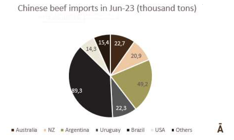 6月份,234065噸牛肉運(yùn)抵中國,其中6288噸為冰鮮肉類,227777噸為冷凍牛肉。根據(jù)中國海關(guān)數(shù)據(jù),冰鮮牛肉的平均進(jìn)口價(jià)格為11063美元/噸,而冷凍牛肉的進(jìn)口價(jià)格達(dá)到5356美元/噸。南方共同市場國家占總量的69%,89345噸來自巴西,平均價(jià)格為5400美元/噸,49195噸來自阿根廷,價(jià)格為4485美元/噸,22135噸來自烏拉圭,價(jià)格為4197美元/噸。就冰鮮牛肉而言,52%來自澳大利亞,平均價(jià)格為10753美元/噸。