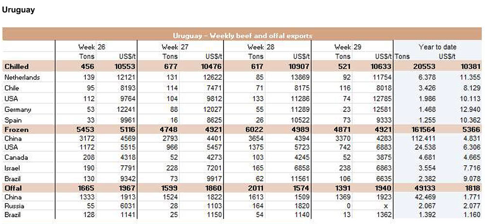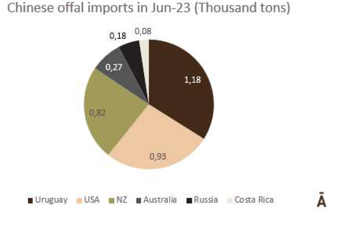 6月份,中國進(jìn)口了3471噸牛內(nèi)臟,其中1178噸(34%)來自烏拉圭。巴西和阿根廷的內(nèi)臟不能直接進(jìn)入中國市場。6月份排名靠前的其他兩位供應(yīng)商是美國(27%)和新西蘭(24%)。從烏拉圭進(jìn)口的內(nèi)臟平均價(jià)格為5485美元/噸,而從美國進(jìn)口的內(nèi)臟平均價(jià)格是4897美元/噸,從新西蘭進(jìn)口的內(nèi)臟價(jià)格為6014美元/噸。