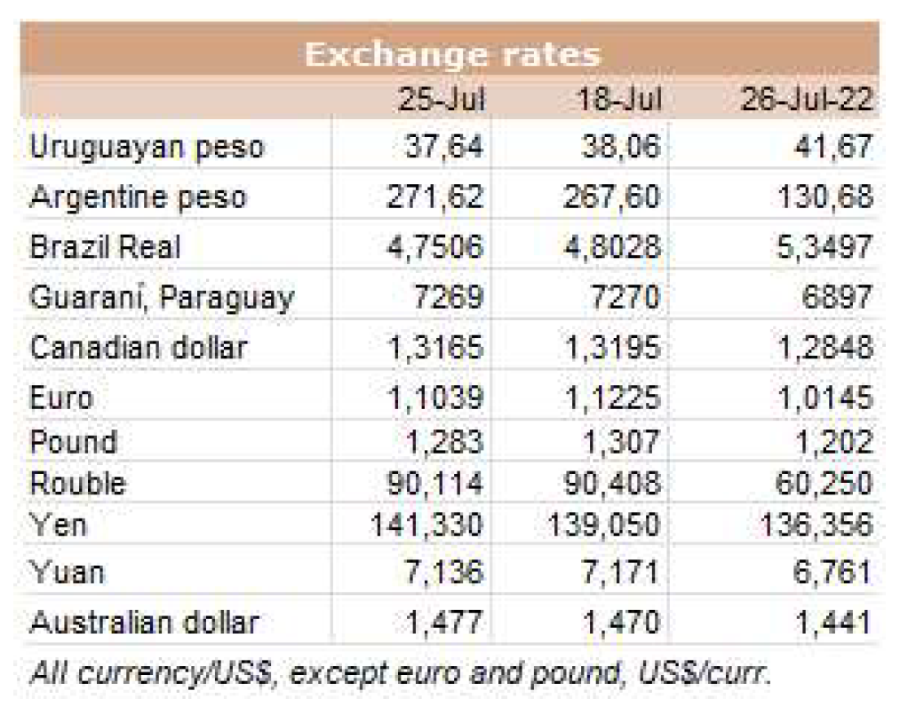 一位貿(mào)易商稱,智利進(jìn)口市場保持著控制“邊境開放的情況下貨物的具體到貨量”的節(jié)奏。 他補(bǔ)充道,烏拉圭和巴西的19-20分體價(jià)格是CIF 5400-5600。消息人士評(píng)論道:“智利人正在等待市場吸收即將到來的東西,以便在國慶節(jié)期間外出購買,今年的國慶節(jié)會(huì)有點(diǎn)復(fù)雜?!?。