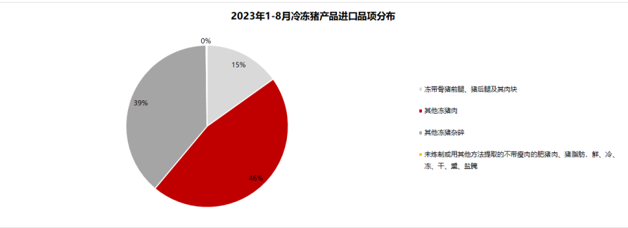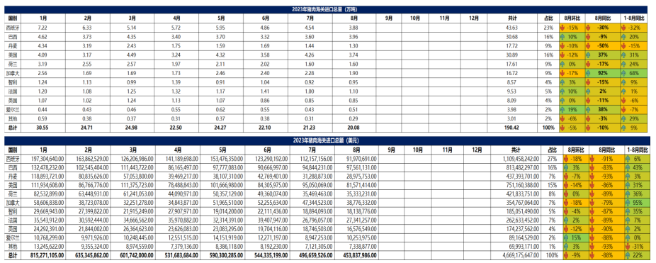 2023 年 8 月中國主港豬肉進口量 20.08 萬噸,環(huán)比減少 5%,同比減少 10%。1-8 月主 港豬肉進口量 190.42 萬噸,同比增加 9%。從進口國別看,其中,從西班牙進口豬肉共計 43.63 萬噸,同比減少 3.2%,占比 23%。從美國進口豬肉共計 30.89 萬噸,同比增加 31%,占比 16%。從巴西進口豬肉共計 30.68 萬噸,同比增加 20%,占比 16%。從丹麥進口豬肉共計 17.72 萬噸,同比減少 15%。值得關注的是,8 月巴西豬肉進口量 3.96 萬噸,環(huán)比增加 10%, 同比減少 9%,首月超過從西班牙進口豬肉數量(3.88 萬噸),排名第一。從進口品項看,1-8 月,凍帶骨豬前腿、豬后腿及其肉塊進口量 28.81 萬噸,占比 15%。其他凍豬肉進口量 87.51 萬噸,占比 46%。其他凍豬雜碎 73.70 萬噸,占比 39%。豬油脂類進口量僅 0.37 萬噸。從 進口金額看,1-8 月,主港豬肉進口總額 46.69 億美金,同比上漲 22%。其中,進口西班牙 豬肉金額 11.09 億美金,同比上漲 6%。進口巴西豬肉金額 8.13 億美金,同比上漲 43%。進 口美國豬肉金額 7.51 億美金,同比上漲 31%。進口丹麥豬肉金額 4.37 億美金,同比上漲 3%。