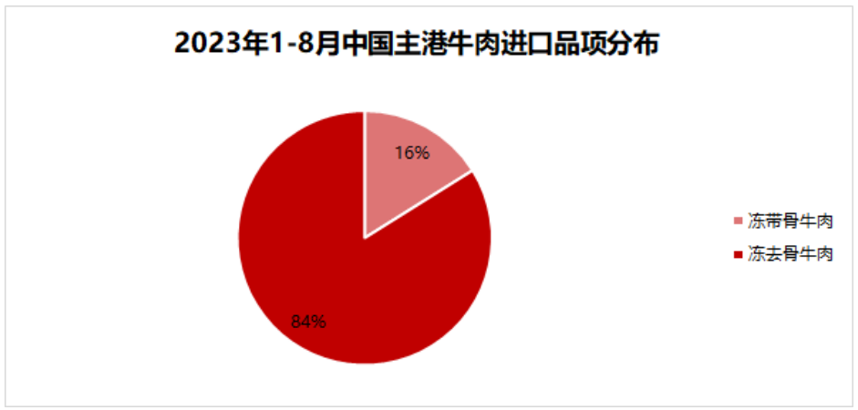 2023 年 8 月中國主港牛肉進口量 26.09 萬噸,環(huán)比減少 10%,同比減少 3%。1-8 月, 中國主港牛肉進口總量 174.90 萬噸,同比增加 5%。從進口國別看,進口巴西牛肉 73.50 萬 噸,同比增加 18%,占比 42%。進口阿根廷牛肉 35.38 萬噸,同比增加 13%,占比 20%。進口烏拉圭牛肉 18.84 萬噸,同比減少 29%,占比 11%。進口新西蘭牛肉 14.31 萬噸,與去 年同期持平,占比 8%。進口澳大利亞牛肉 12.93 萬噸,同比增加 25%,占比 7%。從進口品 項看,凍去骨牛肉進口總量 146.75 萬噸,占比 84%。凍帶骨牛肉進口總量 28.14 萬噸,占比 16%。從進口金額看,1-8 月,中國主港牛肉進口金額共計 91.16 億美金,同比減少 17%。其中,巴西牛肉進口金額 38.64 億美金,同比減少 20%。阿根廷牛肉進口金額 15.12 億美金, 同比減少 36%。澳大利亞牛肉進口金額 8.70 億美金,同比增加 2%。烏拉圭牛肉進口金額 7.81 億美金,同比減少 58%。新西蘭牛肉進口金額 7.44 億美金,同比減少 40%。