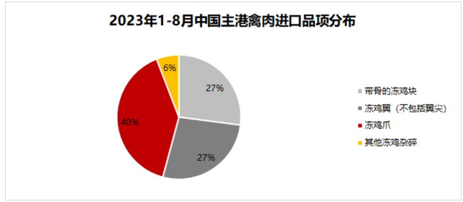 2023 年 8 月中國主港禽肉進口量 10.51 萬噸,環(huán)比減少 9%,同比增加 8%。1-8 月,中 國主港禽肉進口量 92.04 萬噸,同比增加 31%。從進口國別看,進口巴西禽肉共計 47.88 萬 噸,同比增加 74%,占比 52%。進口美國禽肉 17.71 萬噸,同比減少 3%,占比 19%。進口 俄羅斯禽肉 8.68 萬噸,同比增加 3%,占比 9%。進口泰國禽肉 7.45 萬噸,同比增加 56%, 占比 8%。從進口品項看,帶骨凍雞塊進口量 24.91 萬噸,占比 27%。凍雞翼(不包括翼尖) 24.99 萬噸,占比 27%。凍雞爪進口量 36.77 萬噸,占比 40%。其他凍雞雜碎進口量 5.40 萬噸,占比 6%。從進口金額看,1-8 月,中國主港牛肉進口金額共計 29.73 億美金,同比增 加 24%。其中,巴西禽肉進口金額 13.83 億美金,同比增加 66%。美國禽肉進口金額 5.66 億美金,同比下滑 28%。泰國禽肉進口金額 3.36 億美元,同比增加 63%。俄羅斯禽肉進口 金額 3.04 億美金,同比增加 31%。白俄羅斯禽肉進口金額 2.24 億美金,同比增加 101%。