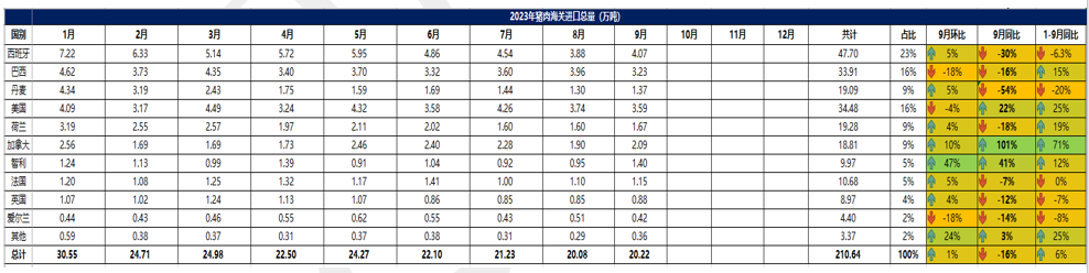 2023 年 9月中國主港豬肉進(jìn)口量 20.22 萬噸,環(huán)比上漲1%,同比減少 16%。1-9 月主 港豬肉進(jìn)口量 210.64 萬噸,同比增加 6%。從進(jìn)口國別看,其中,從西班牙進(jìn)口豬肉共計(jì) 47.7 萬噸,同比減少 6.3%,占比 23%。從美國進(jìn)口豬肉共計(jì) 34.48 萬噸,同比增加 25%,占比 16%。從巴西進(jìn)口豬肉共計(jì)33.91 萬噸,同比增加 15%,占比 16%。從丹麥進(jìn)口豬肉共計(jì) 19.09萬噸,同比減少20%。從進(jìn)口品項(xiàng)看,1-9月,凍帶骨豬前腿、豬后腿及其肉塊進(jìn)口量 30.95萬噸,占比 15%。其他凍豬肉進(jìn)口量95.72萬噸,占比 45%。其他凍豬雜碎 83.44 萬噸,占比 40%。豬油脂類進(jìn)口量僅 0.49 萬噸。從 進(jìn)口金額看,1-9 月,主港豬肉進(jìn)口總額 50.95 億美金,同比上漲 15%。其中,進(jìn)口西班牙 豬肉金額 12.02 億美金,同比持平。進(jìn)口巴西豬肉金額 8.88億美金,同比上漲 33%。進(jìn)口美國豬肉金額 8.27 億美金,同比上漲 22%。進(jìn)口丹麥豬肉金額 4.65億美金,同比減少6%。