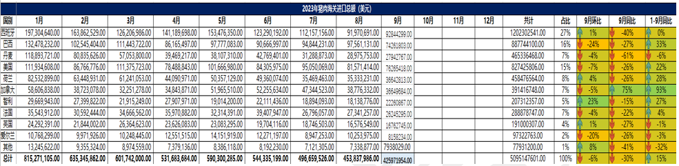 2023 年 9 月冷凍豬肉進(jìn)口概況