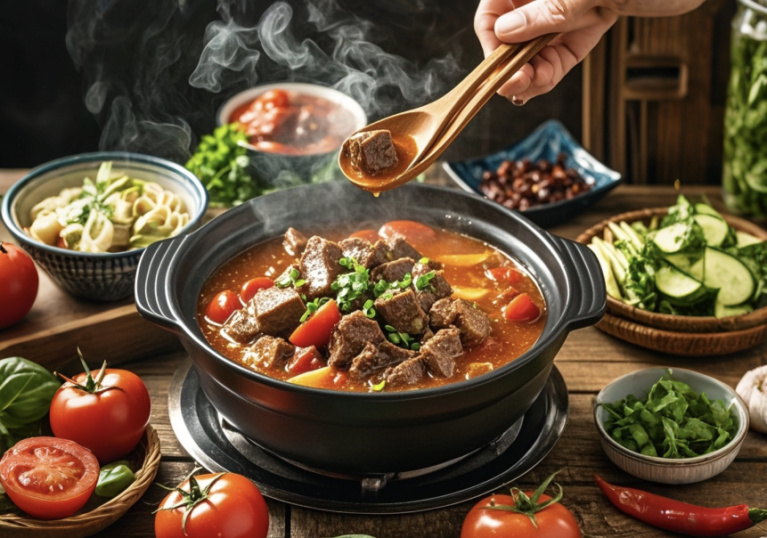 廣式清湯牛腩火鍋以其清淡鮮美而著稱。清澈的湯底,用牛骨和拍姜、香葉、玉竹、陳皮、炒香的胡椒等各種香料熬制而成。牛腩在清湯中煮至軟爛,保留了牛肉的原汁原味,可加入大塊蘿卜。吃的時(shí)候,可以蘸上特制的沙茶醬、海鮮醬或腐乳蘸料等,口感更加豐富。廣式清湯牛腩火鍋?zhàn)⒅厥巢牡男迈r和品質(zhì),通常會(huì)搭配上各種海鮮、肉丸、蔬菜等,鮮美溫補(bǔ)。