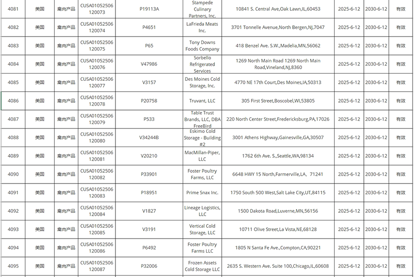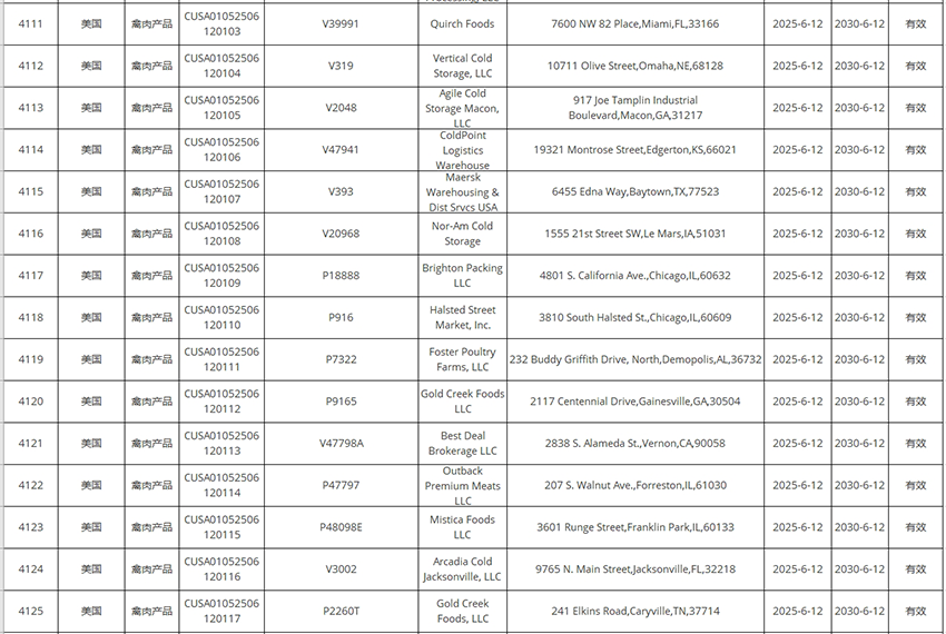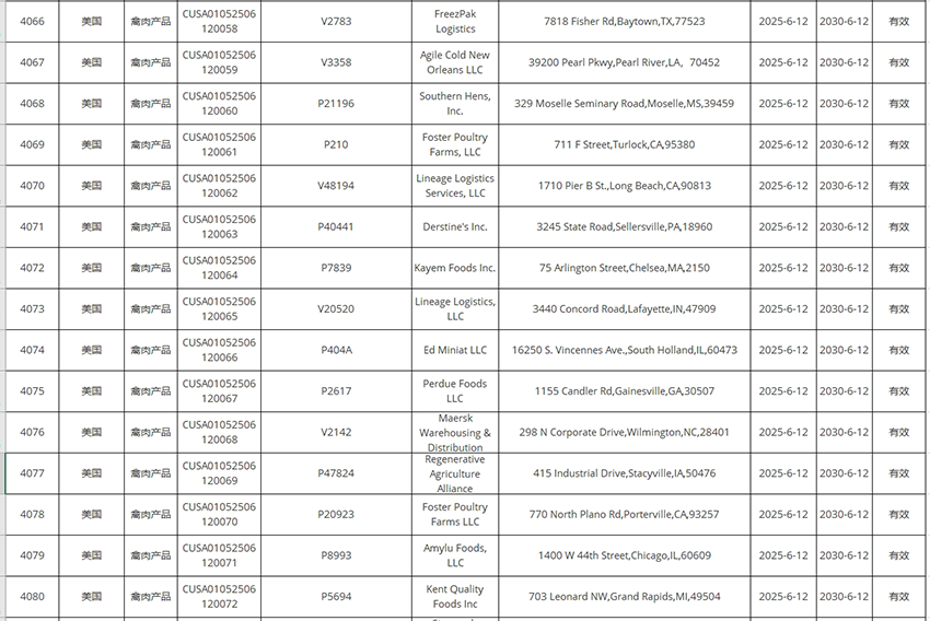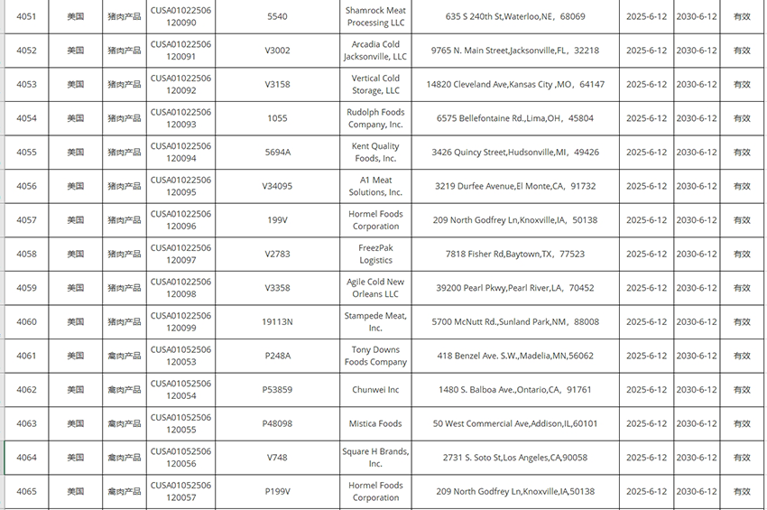 新增美國豬肉、禽肉企業(yè)自2025年6月12日及之后生產的符合中國要求的肉類產品輸華。其中83家禽肉企業(yè),23家豬肉企業(yè)。