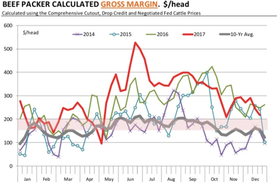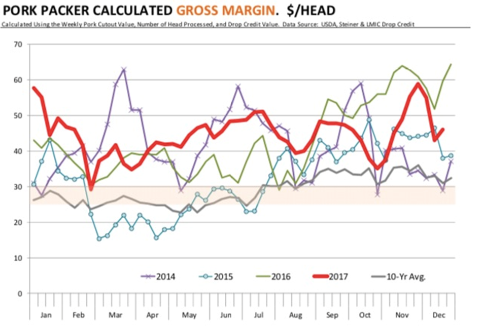 下附兩張圖表描繪了貿(mào)易商在開年的利潤率的不同情況。牛肉貿(mào)易商的利潤率在很大程度上被壓縮到今年年初,部分原因是寒冷的天氣對牛群的影響。在2017年,牛肉貿(mào)易商的利潤率非常好,對2018年的利潤率也仍然保持十分穩(wěn)健的預(yù)期。但是通常一季度的利潤都很低,今年也不會是個例外。當(dāng)所有牛肉需求呈良好態(tài)勢,牛供應(yīng)將持續(xù)增加,也會驅(qū)動對牛肉分銷服務(wù)的需求。在最近兩周牛肉貿(mào)易商的利潤率被擠壓,我們認(rèn)為2017的最后一周的利潤率非常接近于盈虧平衡點。如果精選級牛部位肉價格保持在205美元這個范圍,貿(mào)易商會支付120美元去買牛,剩下的也就接近盈虧平衡,而沒有賺到一點錢。生豬貿(mào)易商在開年的利潤率通常都很高。假期縮短的周數(shù)往往使生豬利潤率延遲,在開年會有一個很大的需求,而這個需求伴隨著市場積壓庫存的清空。寒冷的天氣并沒有對生豬造成多大損失, 因為都被移置于室內(nèi)喂養(yǎng),牛的情況也是如此。在產(chǎn)品方面,貿(mào)易商也非常頭疼節(jié)后后腿需求的暴跌。在這種情況下,生產(chǎn)商會為了保持生豬的流通運轉(zhuǎn)而提供給貿(mào)易商一個足夠大的利潤空間。這個庫存積壓的問題往往能被相當(dāng)快的解決。在1月的下半月我們應(yīng)該會看到一個更加正常的市場狀態(tài)。接下來的挑戰(zhàn)是豬肉在國內(nèi)和國外渠道中的需求。期貨市場現(xiàn)在的價格走勢呈現(xiàn)出了在這個冬季和早春對豬肉的積極需求。去年我們看到了對豬部位肉和生豬需求的顯著激增,此趨勢一直持續(xù)到2月。這也很大程度上歸功于豬五花的高位價格。后腿價格最近持續(xù)疲軟,我們正看到更多的產(chǎn)品在現(xiàn)貨市場交易。和墨西哥的貿(mào)易持續(xù)穩(wěn)定,現(xiàn)在較低的后腿價格應(yīng)該能持續(xù)助力外銷。今年冬天期間生豬疾病的壓力是一個問題,一些報告顯示,豬藍(lán)耳病和豬流行性腹瀉病病例在增加。但情況與我們過去兩年看到的情況類似,目前尚未有太多影響。