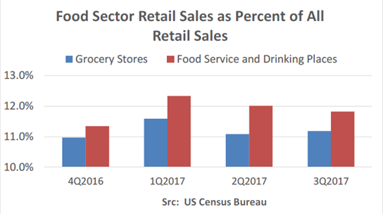 自2008-2009年經(jīng)濟(jì)大衰退以來(lái),牛肉需求的艱難表現(xiàn)使零售銷售在食品行業(yè)增長(zhǎng)節(jié)奏非常之緩慢。11月的零售店銷售額較上年同期增長(zhǎng)了3.4%,但由于今年頭兩個(gè)月和六月與七月的增長(zhǎng)乏力,今年的銷售額可能不會(huì)超過(guò)1.5%。餐飲服務(wù)零售增長(zhǎng)趨勢(shì)敲響了更重的警鐘。 11月餐飲服務(wù)的銷售增長(zhǎng)同比只有2.5%,10月只有1.5%。和2015年的8%和2016年的6%的增長(zhǎng)相比,2017年,餐飲服務(wù)銷售較去年增長(zhǎng)只有2.3%,