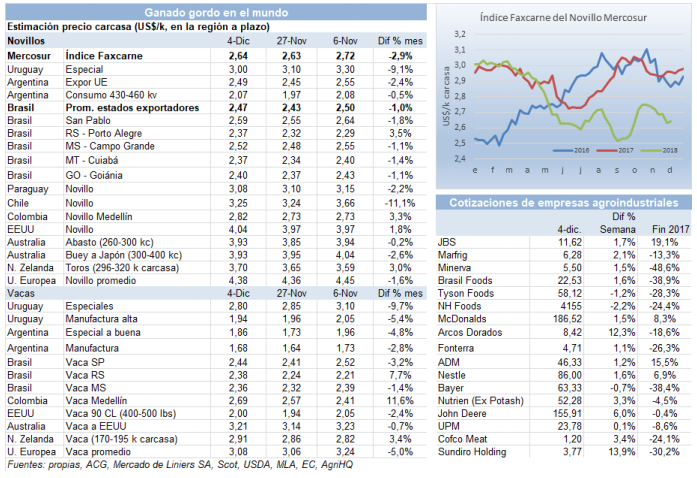 本周南方共同市場閹牛指數(shù)還算堅(jiān)挺,受益于阿根廷和巴西牛價(jià)上升,漲了1美分到2.64美金。巴西本地牛價(jià)上漲,雷亞爾也有所增值,美金牛價(jià)漲了4美分到2.47美金,阿根廷本地牛價(jià)穩(wěn)定,比索增值,美金牛價(jià)也漲了4美分到2.49美金,烏拉圭和巴拉圭正相反,烏拉圭牛價(jià)暴跌10美分到3美金,巴拉圭跌了2美分到3.08美金,因此現(xiàn)在巴拉圭成了該地區(qū)牛價(jià)最高的國家。