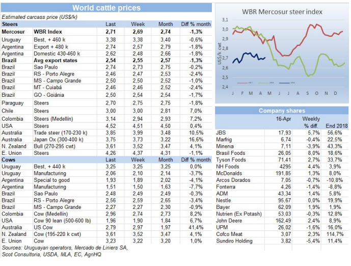 中國(guó)市場(chǎng)還很活躍,不過(guò)有些產(chǎn)品價(jià)格下調(diào)了50美金,非洲豬瘟的影響使肉類蛋白價(jià)格大漲。雖然烏拉圭屠宰量還保持在每周5萬(wàn)頭以上,但工廠不愿意報(bào)太長(zhǎng)的船期,因?yàn)椴恢肋@樣的屠宰節(jié)奏能保持多久。另一個(gè)因素是Sial上海展會(huì)一個(gè)月后要開,今年是5月14-16日。目前巴西牛肉出口香港成交很緩慢,腱子價(jià)格不超過(guò)3300美金。