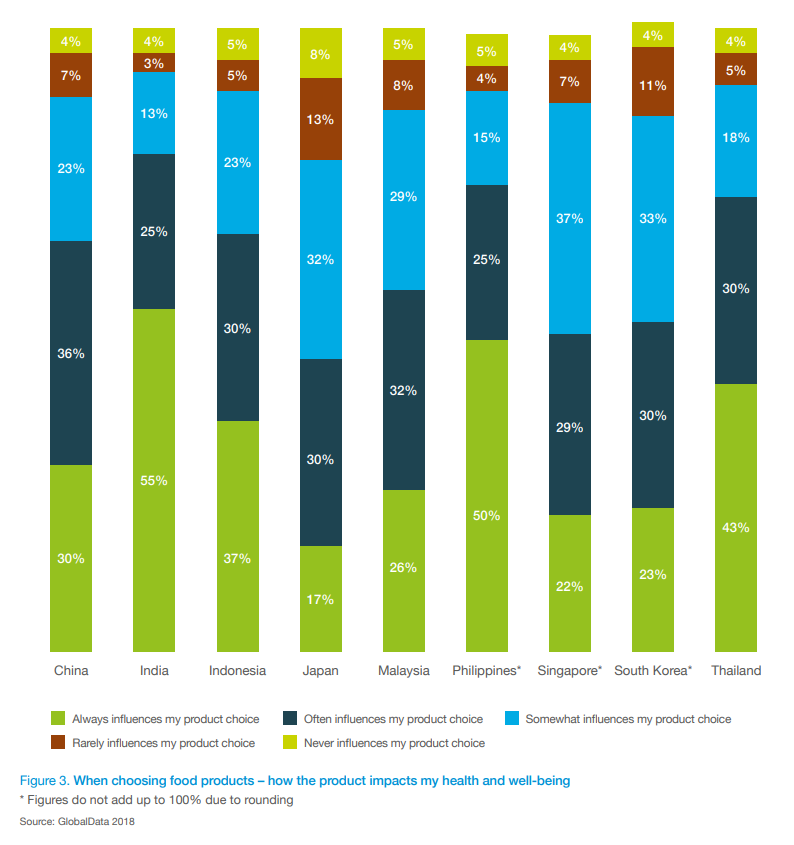隨著生活水平和受教育程度提高,亞洲消費者越來越關(guān)心健康問題。與此同時,飲食結(jié)構(gòu)引發(fā)的慢性病越來越多,消費者更加注重食品對于健康的影響。超半數(shù)亞洲受訪者認為食品對健康的影響是選擇購買時的考慮因素。中國和越南將食品安全作為消費首要考慮因素。不到1/3的中國消費者和25%的日本消費者認為瘦肉更健康。中國和日本消費者對肥肉并不抗拒。但是,在日本女性消費者認為羊肉更健康。(圖三:選購食品——食品如何影響健康和福祉)(表一:選購肉類產(chǎn)品,哪種肉制品,你認為是健康的)