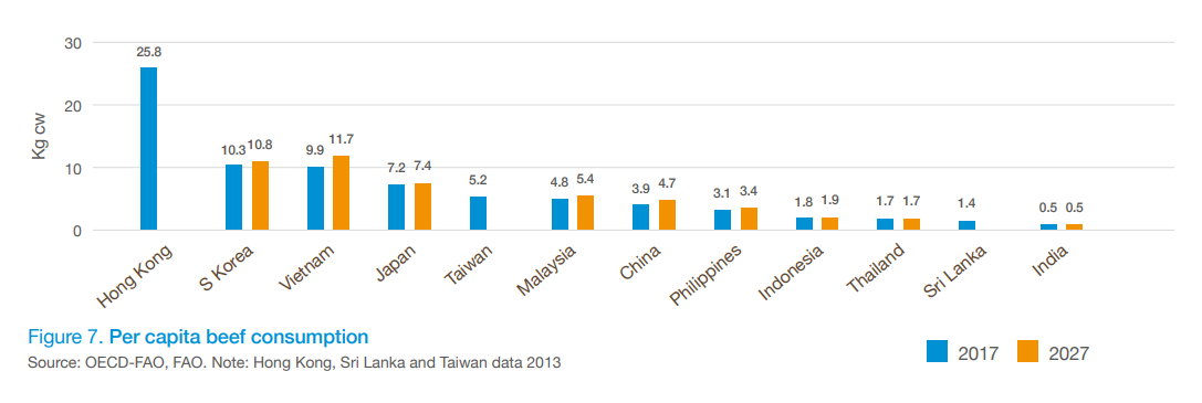 到2027年預(yù)計越南豬肉和牛肉消費增長幅度最大,中國羊肉消費增長幅度最大。(圖六-八:豬肉/牛肉/羊肉人均消費量)