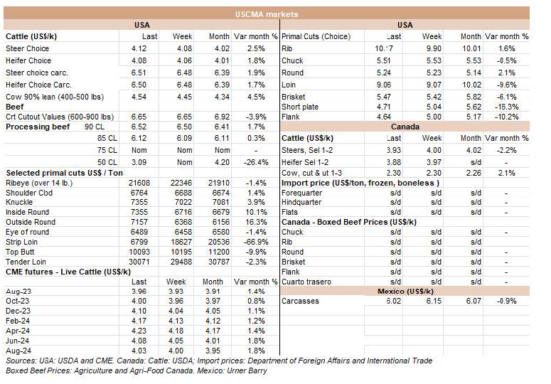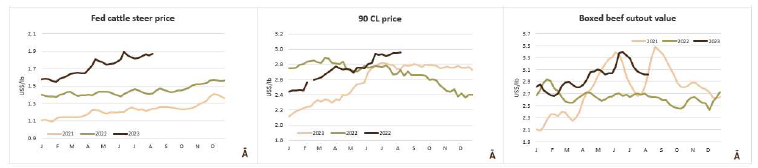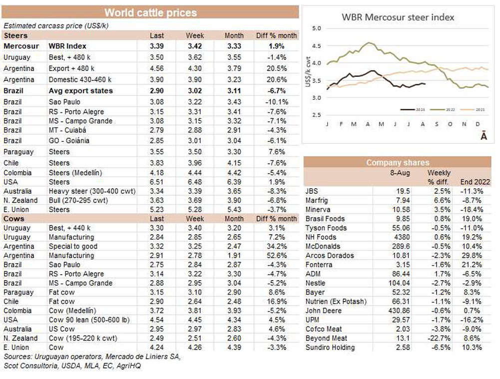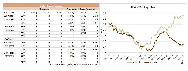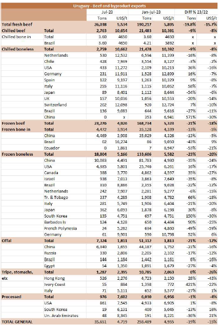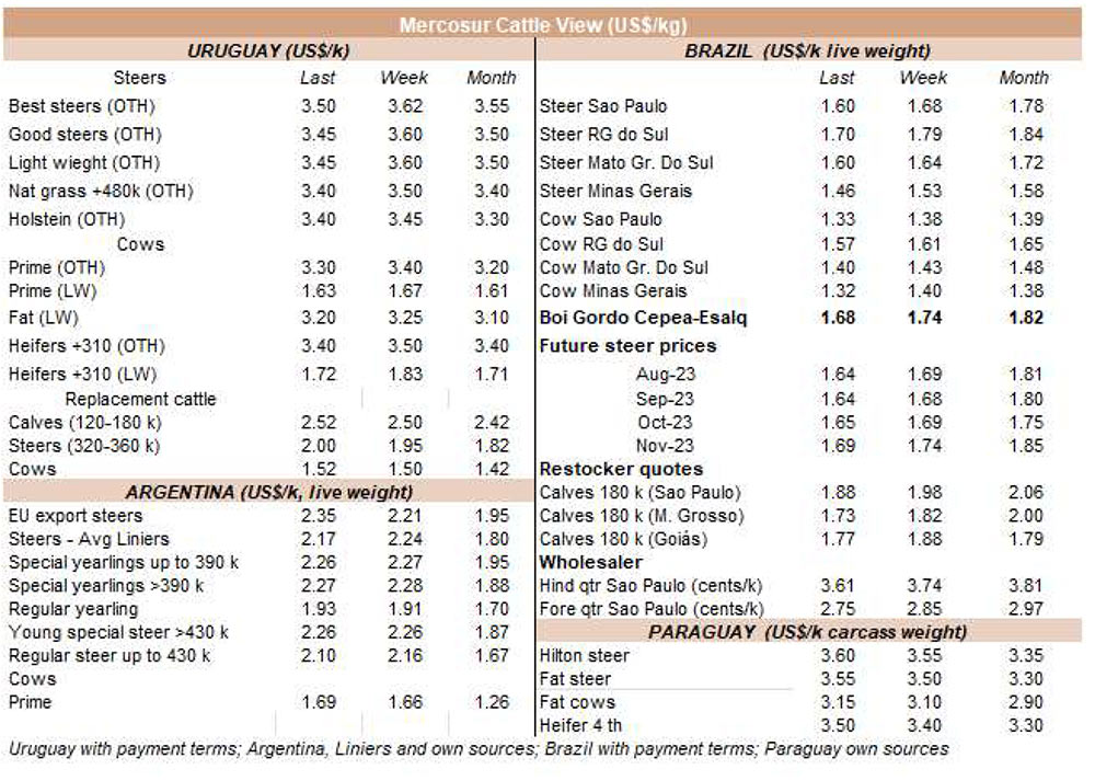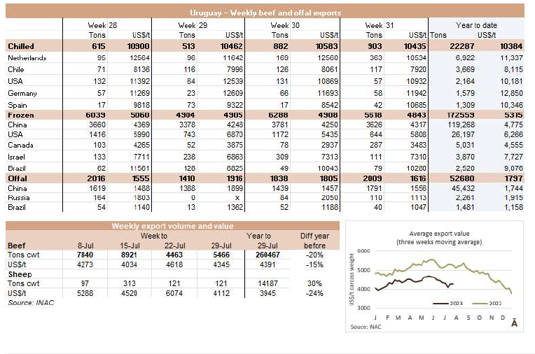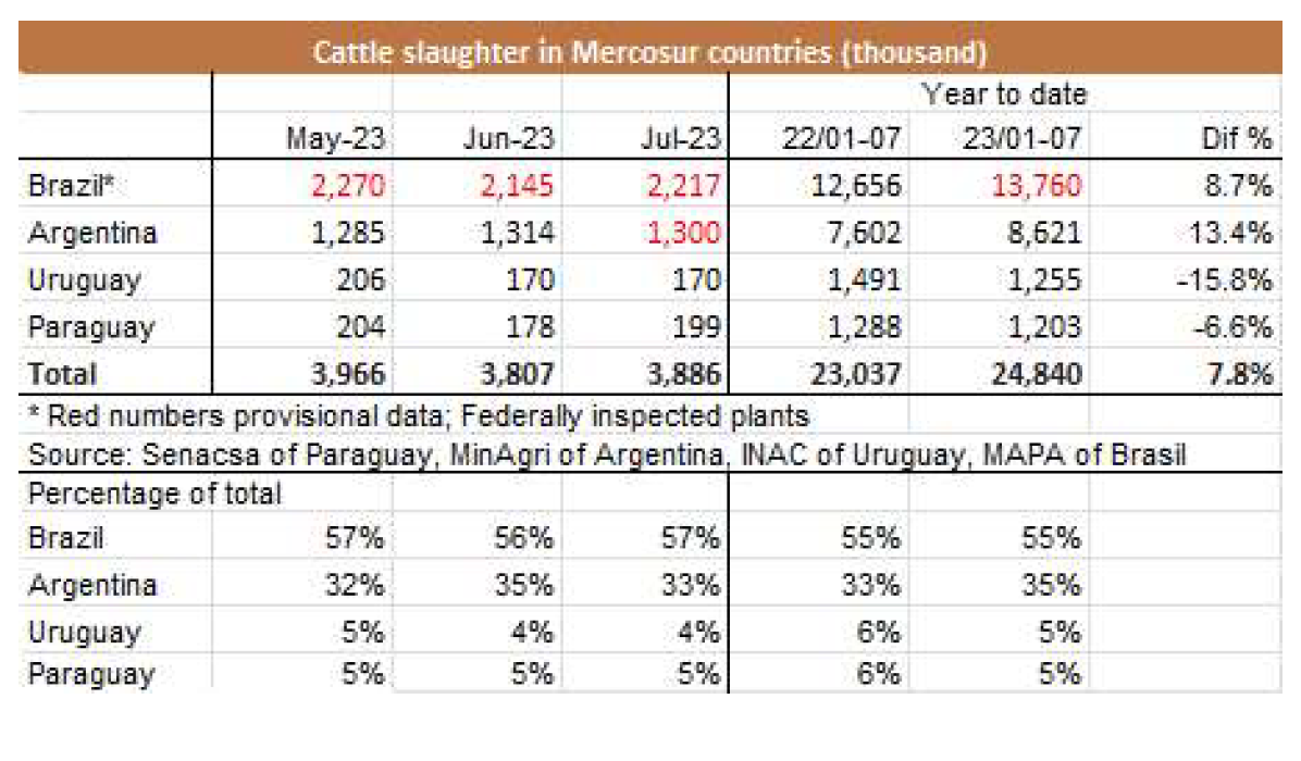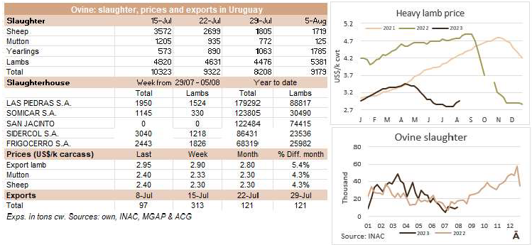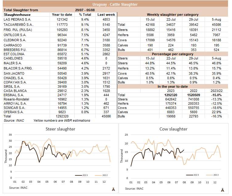 上周屠宰量大幅上升。INAC報(bào)告稱,截至8月6日,有45086頭牛進(jìn)入屠宰場,比上一次增加了5500頭,是自5月中旬以來的最高值。屠宰的組成比例清楚地反應(yīng)了481配額。小母牛是增長數(shù)量最多的,總共有7067頭,這是自2月份以來的最高值。本周,公牛增加2700頭達(dá)到了21112頭。不屬于配額的奶牛僅占屠宰量的36%,有16188頭。本周屠宰最多的工廠是Marfrig-Tacuarembo(5140)、Las Piedras(4853)和Ontilcor(4247)。7月份屠宰量是169558頭牛,同比增長了13.6%。這是自2022年5月以來,年度牛屠宰量首次增加。