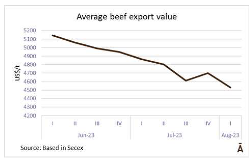 據(jù)外貿(mào)部(Secex)報(bào)告,8月前四個(gè)工作日,巴西出口了41267噸牛肉,平均價(jià)格為4532美元/噸。平均日產(chǎn)量為10317噸,為6月第一周以來的最高值。自6月初以來平均出口值呈下降趨勢,價(jià)格下跌了12%,即613美元/噸。