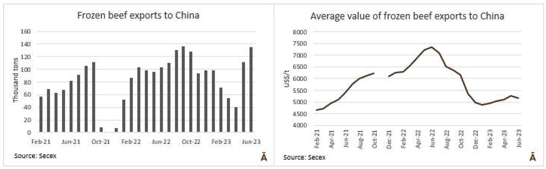7月份對(duì)中國牛肉出口大幅下降,可以看出中國對(duì)牛肉需要的減弱。前一個(gè)月相比,降幅將在5至21萬噸左右。大部分牛肉,尤其是來自南方共同市場,將于8月中旬至9月中旬抵港。與上月相比,7月份巴西對(duì)中國的出口減少了4.3萬噸,這是下降的主要原因。澳大利亞和烏拉圭的出口也有所下降,阿根廷的出口預(yù)計(jì)也出現(xiàn)了同樣的情況。美國農(nóng)業(yè)部預(yù)計(jì),中國今年將進(jìn)口350萬噸牛肉,這意味著每月進(jìn)口量約22.7萬噸牛肉,7月份的出口量低于這個(gè)數(shù)值。