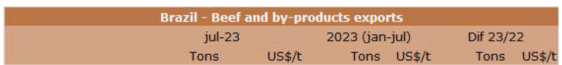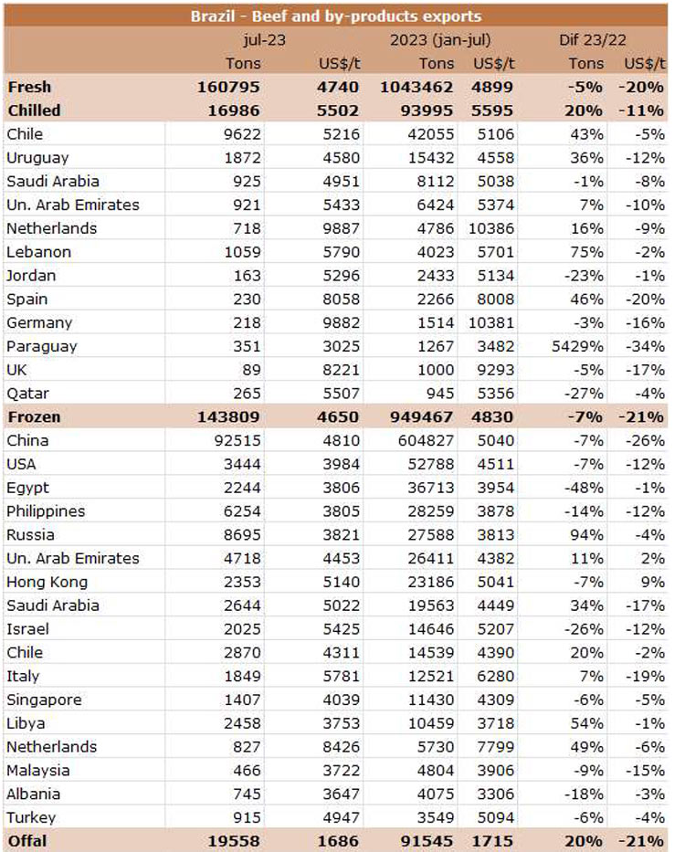 7月份,巴西對(duì)中國的冷凍牛肉平均出口價(jià)格為4810美元/噸,比6月份的平均出口價(jià)格每噸低350美元(-6.8%),為16個(gè)月前2021年3月以來的最低值。7月份中國出口量環(huán)比下降4.3萬噸至92515噸。無論如何,到目前為止,中國仍然是巴西冷凍牛肉的主要出口國,占比為64%。本月冷凍牛肉第二大目的地是俄羅斯(8695噸)。