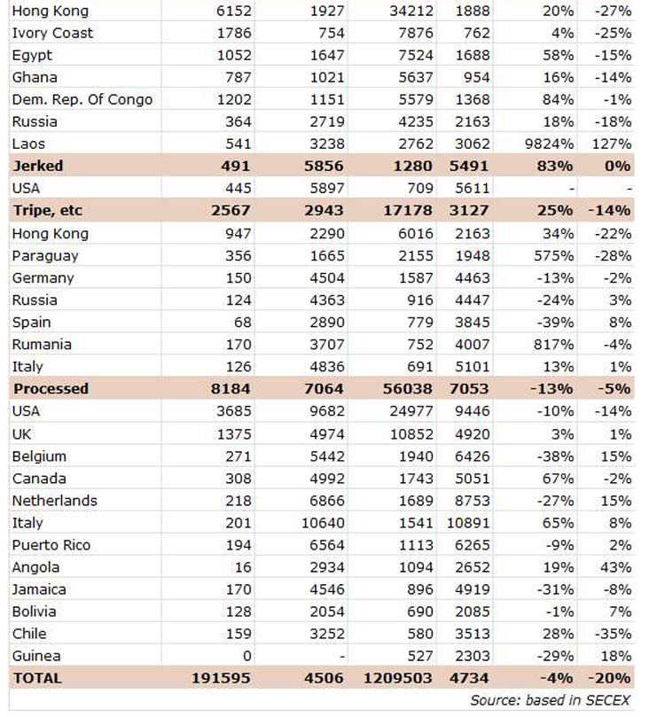 中國需求疲軟導(dǎo)致巴西出口商增加了對(duì)南美市場的出口比例。截至到7月,智利和烏拉圭的冰鮮牛肉出口同比分別增長了43%和36%。這導(dǎo)致今年的冰鮮出口量增長了20%,而目前冷凍出口量每年下降7%。四個(gè)出口量下降的主要目的地分別是:中國(-7%)、美國(-7%)、埃及(-48%)和菲律賓(-14%)。