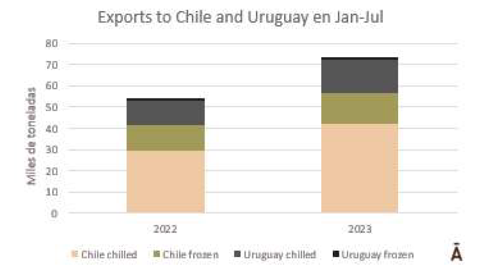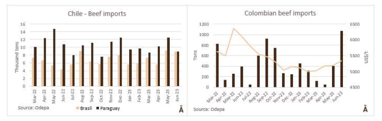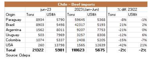 由于智利牛肉進(jìn)口牛價(jià)格的下降,巴西牛肉在國際市場上表現(xiàn)出競爭力。根據(jù)Odepa的數(shù)據(jù),6月份,8903噸巴西牛肉抵達(dá)智利,這是今年迄今為止的最高月度產(chǎn)量,與巴拉圭的牛肉數(shù)量持平。來自哥倫比亞的牛肉量也大幅增加,達(dá)到1074噸,是過去至少兩年來的最高出口量。2023年上半年,智利進(jìn)口了59645噸牛肉,比2022年同期減少了8%。