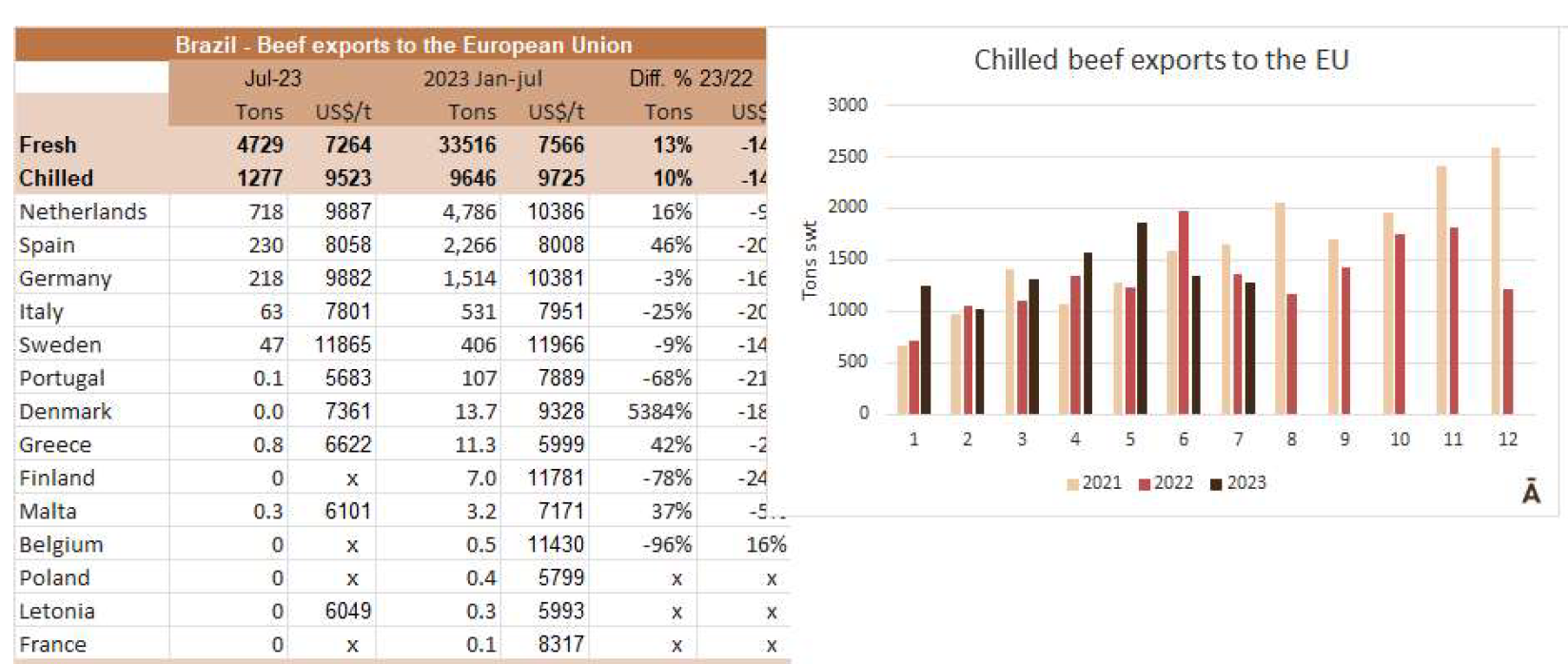 巴西向歐盟國家出口了1277噸冰鮮牛肉,比6月份減少了70噸,是自2月份以來的最低出口量。當(dāng)月凍結(jié)出口累計(jì)3452噸,比6月份增加464噸。