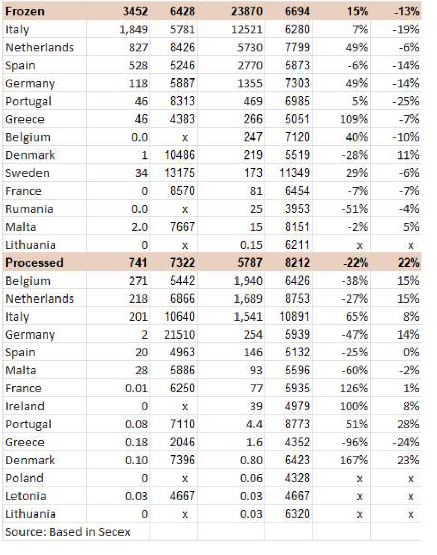 在下周日阿根廷(Paso)初選前幾天,牛屠宰量減少導(dǎo)致歐洲希爾頓價(jià)格瘋狂上漲(請(qǐng)看阿根廷)。上周末,阿根廷臀腰肉價(jià)格為FOB 13300-13700美元之間,而本周價(jià)格則達(dá)到了FOB 14000美元。一位貿(mào)易商稱:“本周我停止了購買。歐洲需求并不能證明這些高價(jià)是合理的,肉類將在10月中旬抵達(dá),而10月中旬并不是假期?!?/span>據(jù)知情人士透露,烏拉圭利用歐洲進(jìn)口冰鮮市場的價(jià)格調(diào)整,希爾頓牛臀腰肉的價(jià)格達(dá)到12500-12800美元/噸。