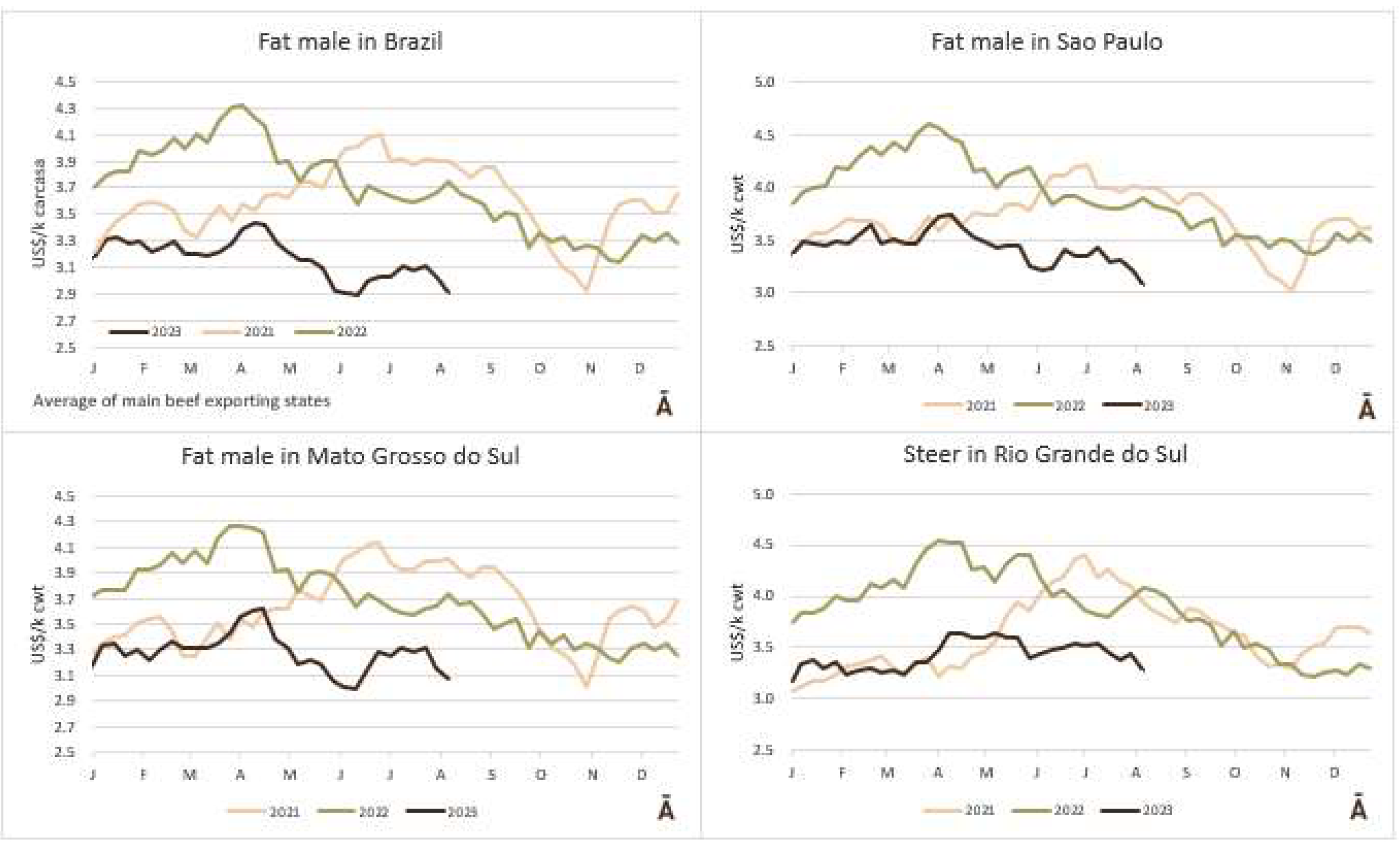 屠宰牛價(jià)格本周繼續(xù)呈下降趨勢。根據(jù)蘇格蘭咨詢公司的參考資料,在圣保羅本周初,公牛價(jià)格是226.5雷亞爾/15公斤免稅,30天內(nèi)付清,比上一次低了5雷亞爾。所謂的屠宰時(shí)不到30個(gè)月“中國?!保鐑r(jià)5雷亞爾/15公斤的報(bào)價(jià),本周也下跌了R$5/15公斤。巴西的主要養(yǎng)牛州平均價(jià)格為195.7雷亞爾/15公斤,比上周下降了1.2雷亞爾。批發(fā)市場的牛肉價(jià)格在本月前幾天上漲后略有回落。
