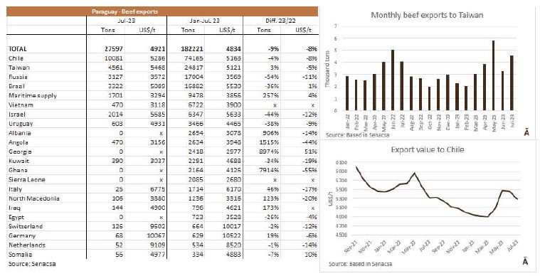 根據(jù)Senacsa的數(shù)據(jù),巴拉圭7月份以4921美元/噸的平均價(jià)格出口了27597噸牛肉。比6月份增加了1300噸,同比減少了8000噸(-22%)。與上個(gè)月相比,每噸的平均價(jià)格下降了100美元多一點(diǎn),這是連續(xù)第二個(gè)月出現(xiàn)收縮,落后于2月至5月的持續(xù)上升趨勢,在此期間,價(jià)格回升了500美元/噸。對(duì)于智利的出口價(jià)格的下降,巴拉圭主要客戶這個(gè)月平均價(jià)格下降了180美元/噸。作為巴拉圭牛肉的第二大目的國的臺(tái)灣,今年迄今為止的出貨量增長了3%,而年出口總額則下降了9%。