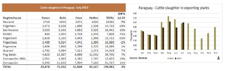 巴拉圭上半年的牛屠宰量月同比都低于2022年,下半年開始有所好轉(zhuǎn)。Senacsa報(bào)告稱,近19.9萬頭牛進(jìn)入屠宰場,比2022年7月多了近4000頭。良好的天氣和飼料條件可能會(huì)加快屠宰速度,因此下半年的屠宰動(dòng)態(tài)可能會(huì)高于2022年。最大的屠宰廠集團(tuán)Minerva,在四家屠宰廠加工了78544頭牛(占總數(shù)的39%),而管理三家屠宰廠的Concepcion集團(tuán)屠宰了61225頭牛(31%)。
