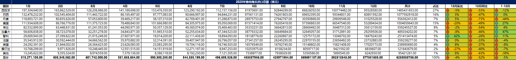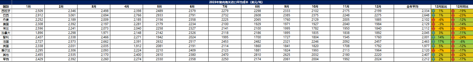 2023 年 12月中國(guó)主港豬肉進(jìn)口量17.7萬(wàn)噸,環(huán)比下降4%,同比減少41%。1-12月主港豬肉進(jìn)口量 264.42萬(wàn)噸,同比下降5%。從進(jìn)口國(guó)別看,其中,從西班牙進(jìn)口豬肉共計(jì)60.27萬(wàn)噸,同比減少12.9%,占比 23%。從美國(guó)進(jìn)口豬肉共計(jì)42.49萬(wàn)噸,同比增加9%,占比 9%。從巴西進(jìn)口豬肉共計(jì)42.23萬(wàn)噸,同比持平,占比 16%。從丹麥進(jìn)口豬肉共計(jì) 23.45萬(wàn)噸,同比減少33%。從進(jìn)口品項(xiàng)看,1-12月,凍帶骨豬前腿、豬后腿及其肉塊進(jìn)口量 36.41萬(wàn)噸,占比 14%。其他凍豬肉進(jìn)口量117.62萬(wàn)噸,占比 45%。其他凍豬雜碎109.6萬(wàn)噸,占比 41%。豬油脂類(lèi)進(jìn)口量?jī)H 0.78萬(wàn)噸。從 進(jìn)口金額看,1-12月,主港豬肉進(jìn)口總額 62.35億美金,同比下降 5%。其中,進(jìn)口西班牙 豬肉金額 14.8億美金,同比下降12%。進(jìn)口巴西豬肉金額10.77億美金,同比持平。進(jìn)口美國(guó)豬肉金額 10.04億美金,同比上漲27%。進(jìn)口丹麥豬肉金額 5.56億美金,同比減少44%。