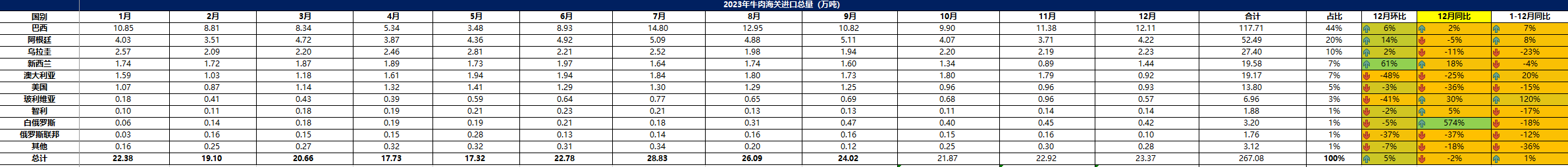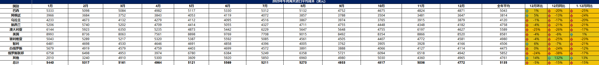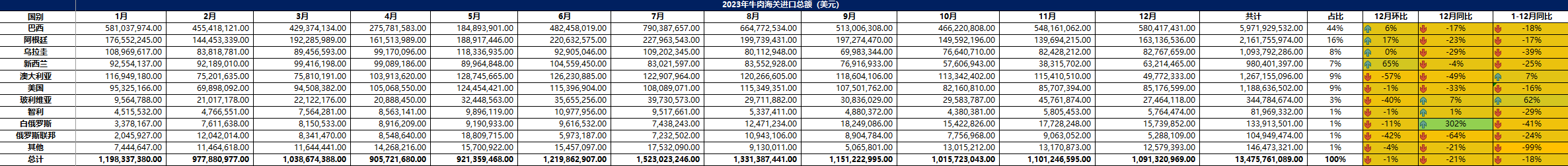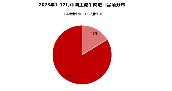 2023 年 12月中國(guó)主港牛肉進(jìn)口量23.37萬(wàn)噸,環(huán)比上升6%,同比上漲2%。1-12月, 中國(guó)主港牛肉進(jìn)口總量 267.08萬(wàn)噸,同比下降 2%。從進(jìn)口國(guó)別看,進(jìn)口巴西牛肉 117.7萬(wàn) 噸,同比上漲7%,占比 44%。進(jìn)口阿根廷牛肉52.49萬(wàn)噸,同比增加 8%,占比 20%。 進(jìn)口烏拉圭牛肉27.4萬(wàn)噸,同比減少23%,占比 10%。進(jìn)口新西蘭牛肉 19.58萬(wàn)噸,同比下降4%,占比 7%。進(jìn)口澳大利亞牛肉 19.17萬(wàn)噸,同比增加 20%,占比 7%。從進(jìn)口品項(xiàng)看,凍去骨牛肉進(jìn)口總量223.55萬(wàn)噸,占比 84%。凍帶骨牛肉進(jìn)口總量 43.51萬(wàn)噸,占比 16%。從進(jìn)口金額看,1-12月,中國(guó)主港牛肉進(jìn)口金額共計(jì) 1347.5億美金,同比減少 18%。 其中,巴西牛肉進(jìn)口金額597.2億美金,同比下降18%。阿根廷牛肉進(jìn)口金額216.17億美金, 同比減少 17%。澳大利亞牛肉進(jìn)口金額126.7億美金,同比增加 7%。烏拉圭牛肉進(jìn)口金額109.37 億美金,同比減少 39%。新西蘭牛肉進(jìn)口金額98億美金,同比減少25%。