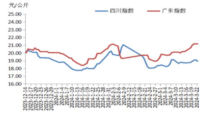 本周,廣東豬肉周均價為每公斤21.04元,環(huán)比上漲4.5%,同比上漲1.0%。周前期,本地區(qū)散養(yǎng)戶出欄生豬節(jié)奏平穩(wěn),外省調入廣東地區(qū)的豬源減少,致使本地區(qū)生豬總供應偏緊,支撐生豬及豬肉價格有所上漲。周后期,隨著豬肉價格持續(xù)上漲,終端需求趨穩(wěn)、無明顯增量,豬肉價格漲后趨穩(wěn)。總體看,本周廣東地區(qū)豬肉周均價環(huán)比上漲。