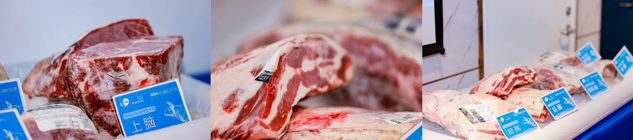 活動現場展示阿根廷谷飼牛肉部位,包括上腦、嫩肩、眼肉、西冷、板腱、眼肉蓋、保樂肩、后胸、前胸、牛霖等。