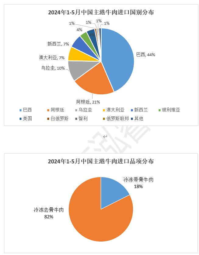 從進(jìn)口品項(xiàng)看,冷凍帶骨牛肉1-5月平均單價2684美元/噸,進(jìn)口來源主要分布在烏拉圭、阿根廷、新西蘭和澳大利亞。冷凍去骨牛肉1-5月進(jìn)口平均單價5150美元/噸,進(jìn)口來源主要分布在巴西、阿根廷、澳大利亞、烏拉圭和美國。